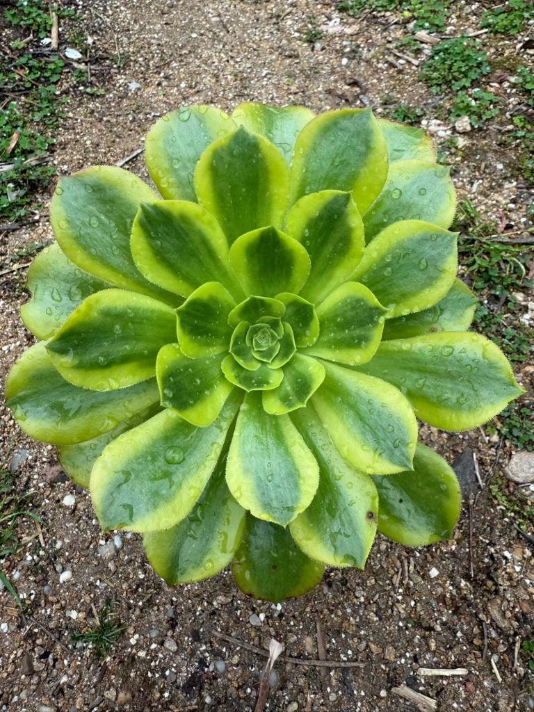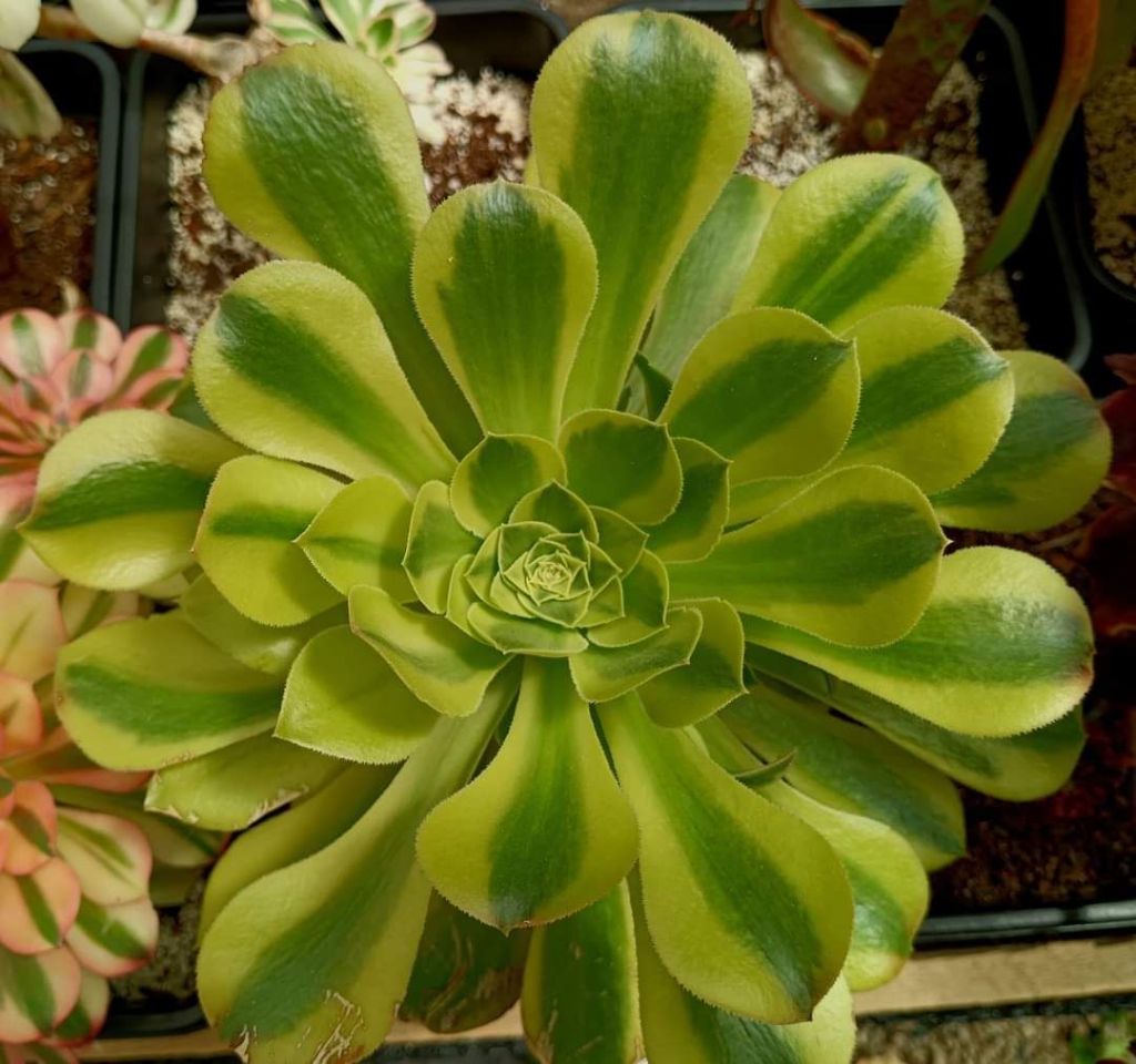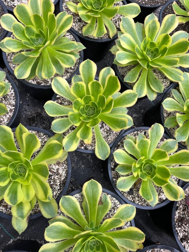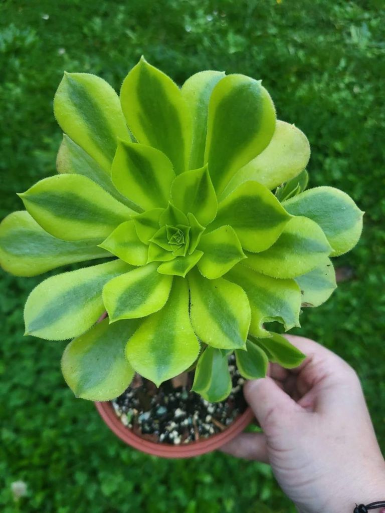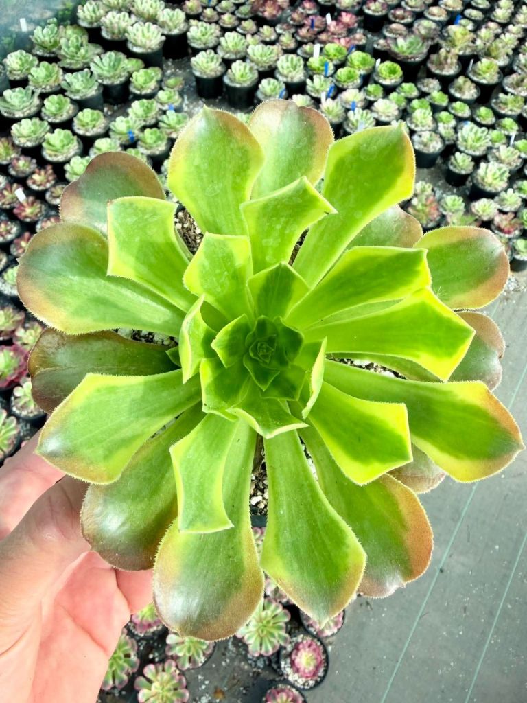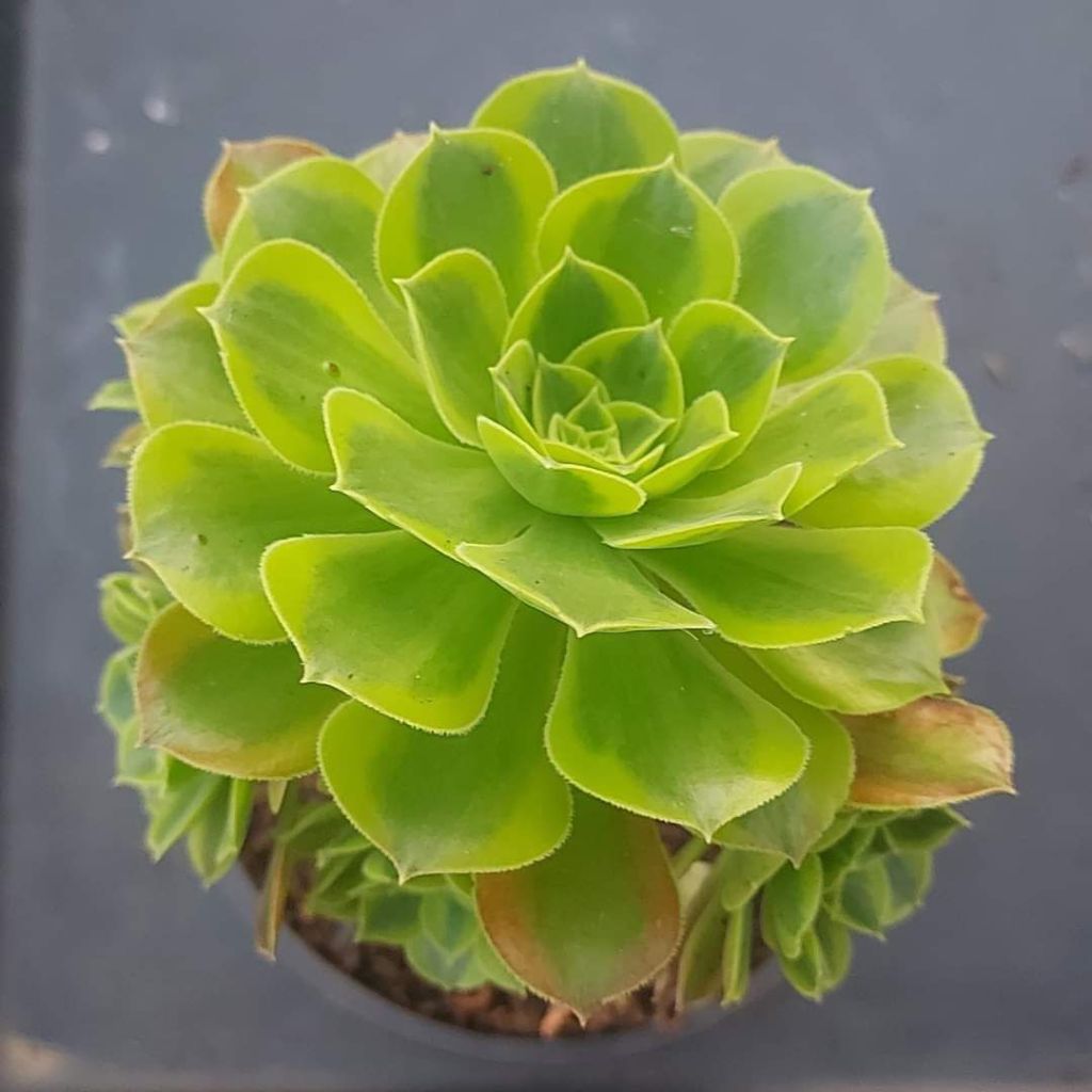 Aujourd’hui je vais vous raconter une nouvelle histoire, celle de l’Aeonium Green Lemon. Il a une histoire loin d’être aussi idyllique que les autres Aeonium variegata que je vous ai raconté. Il a été découvert courant 2018 dans une serre en Chine par M. Yufan Ji et il a été acheté par Wang Baozhong (aka Zhizhuo Baoye) de Zhizhuo Gardenning et n’a pas suscité d’enthousiasme particulier car c’était un variegata de plus de Blushing Beauty alors qu’il en existait déjà d’autres. Tout a commencé par une toute petite rosette que le découvreur a lui même qualifié de « laide ». Et puis sa couleur était moins flamboyante que d’autres et Wang Baozhong avait déjà beaucoup à faire dans la multiplication de nombreuses autres variétés de variegata. Bref cela n’a pas été un coup de foudre comme pour Verna ou Medusa.