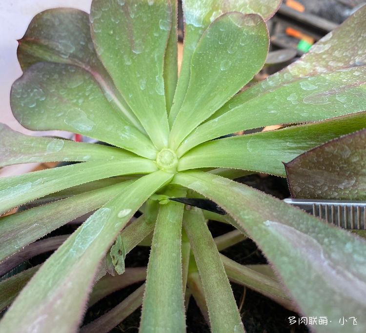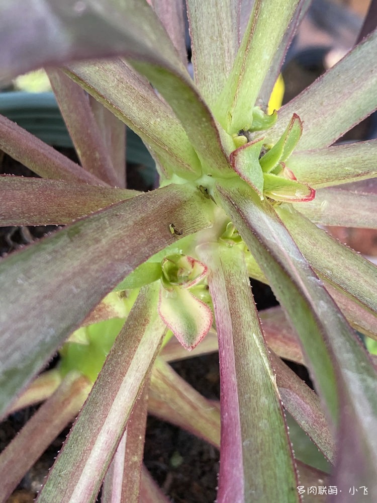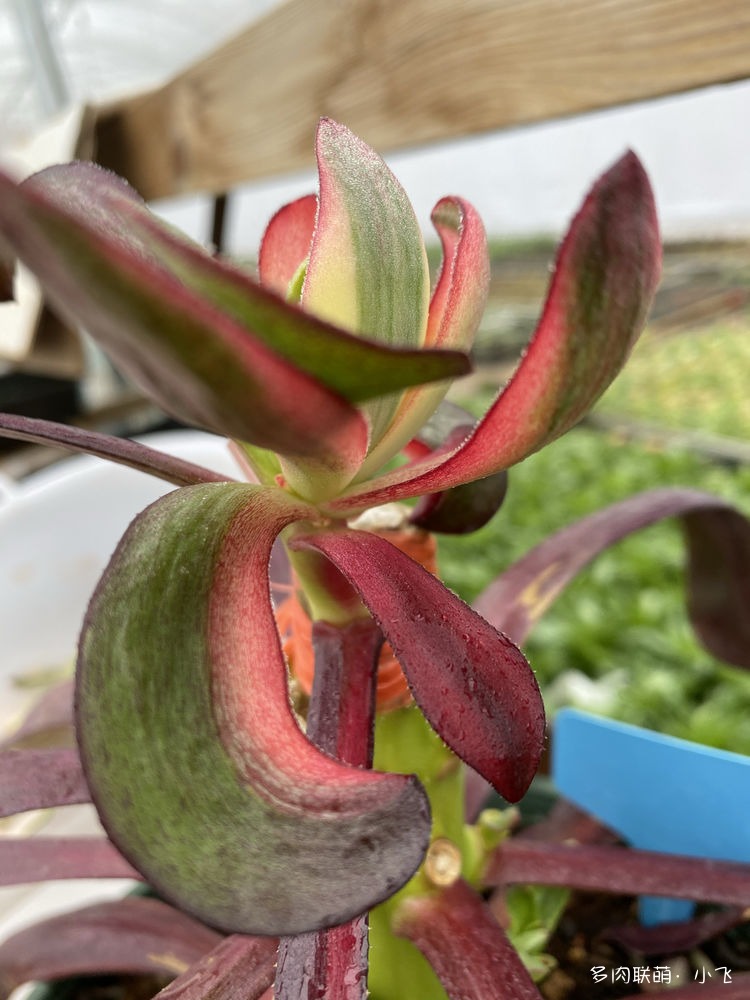 Comme il a été dit plus tôt, la feuille de ‘Voodoo Flame’ est concave, c’est précisément pour cette raison que la forme générale de cet Aeonium est très distinctive. Que ce soit la période de croissance ou la période de dormance, les feuilles sont toutes tournées vers le haut, De plus, les couleurs sont très vives, et de côté, cela ressemble à une flamme déchaînée! Par conséquent, il s’appelle Flame (Flamme en français). C’est aussi simple que cela! Mais à cette époque quand le nom a été choisi, Xiaofei et ses collègues, et quelques amis ont réfléchi ensemble et ont beaucoup réfléchi et plusieurs noms ont été évoqué comme Hibiscus, Charm, Rose, Rouge, Neon clothes et donc flame. Finalement, après avoir discuté entre eux il a été décidé de façon unanime que Flame était le plus approprié.