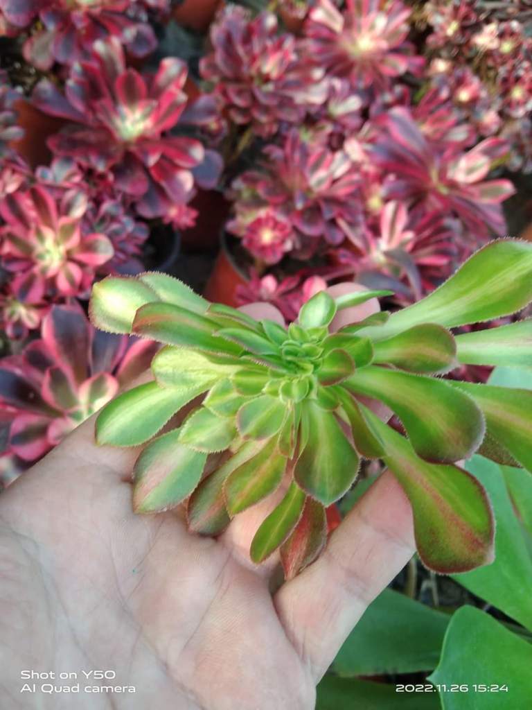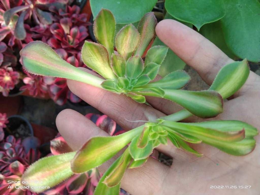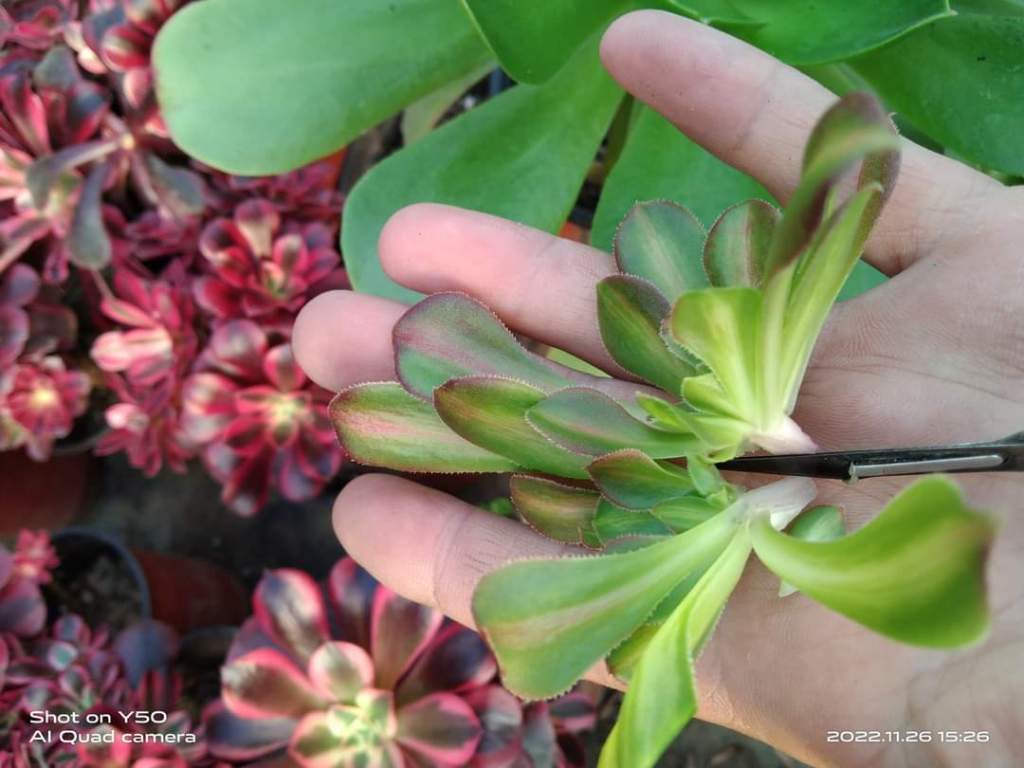 -Greffon: Bouture d’Aeonium destinée à être fusionnée avec le porte‑greffe en vue de reproduire l’espèce ou le cultivar dont il est issu en vue d’accélérer son développement.
