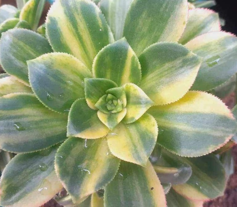 Noms connus : ‘Kiwi variegata’ (mais il ne serait pas une mutation de l’Aeonium ‘Dream Color’).