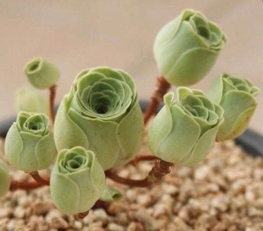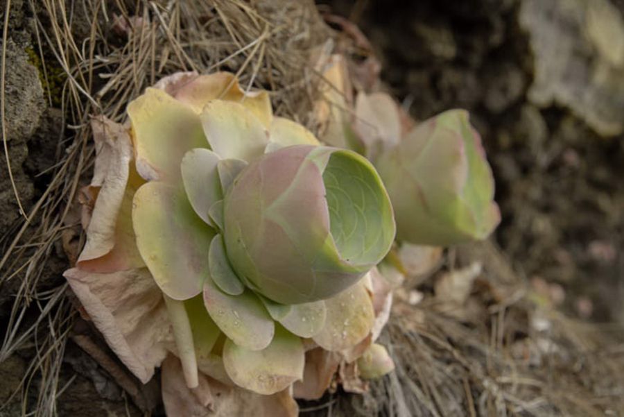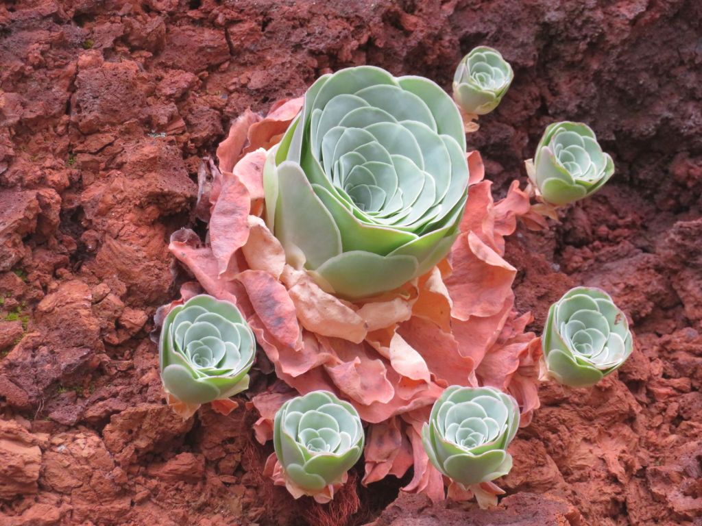L’Aeonium dodrantale (ou Greenovia Dodrantalis aka Mountain Rose) est le plus généreux en rosettes, on le retrouve à l’état naturel dans les montagnes de Tenerife (Iles Canaries). Il a la particularité comme tous les greenovias de se refermer pour se protéger tels des boutons de rose en période estivale.