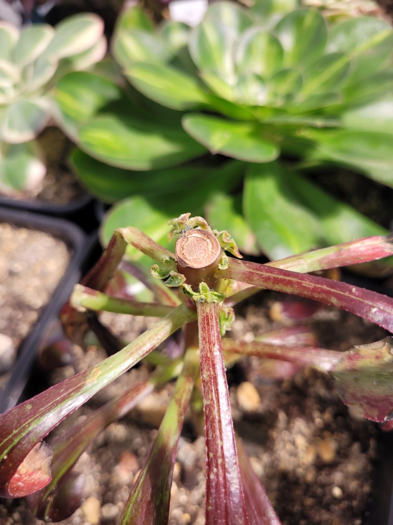 Cette technique est utilisée quand on constate que la tige principale de l’Aeonium est chétive ou très étroite. Il peut être dès lors opportun de décapiter la rosette principale (qui sera gardé et enraciné à part. utilisez la même technique que précédemment « Multiplication par bouturage de rosettes ». Une fois enraciné elle sera beaucoup plus forte et vigoureuse. De nombreux rejets vont aussi certainement sortir sur cette rosette principale.