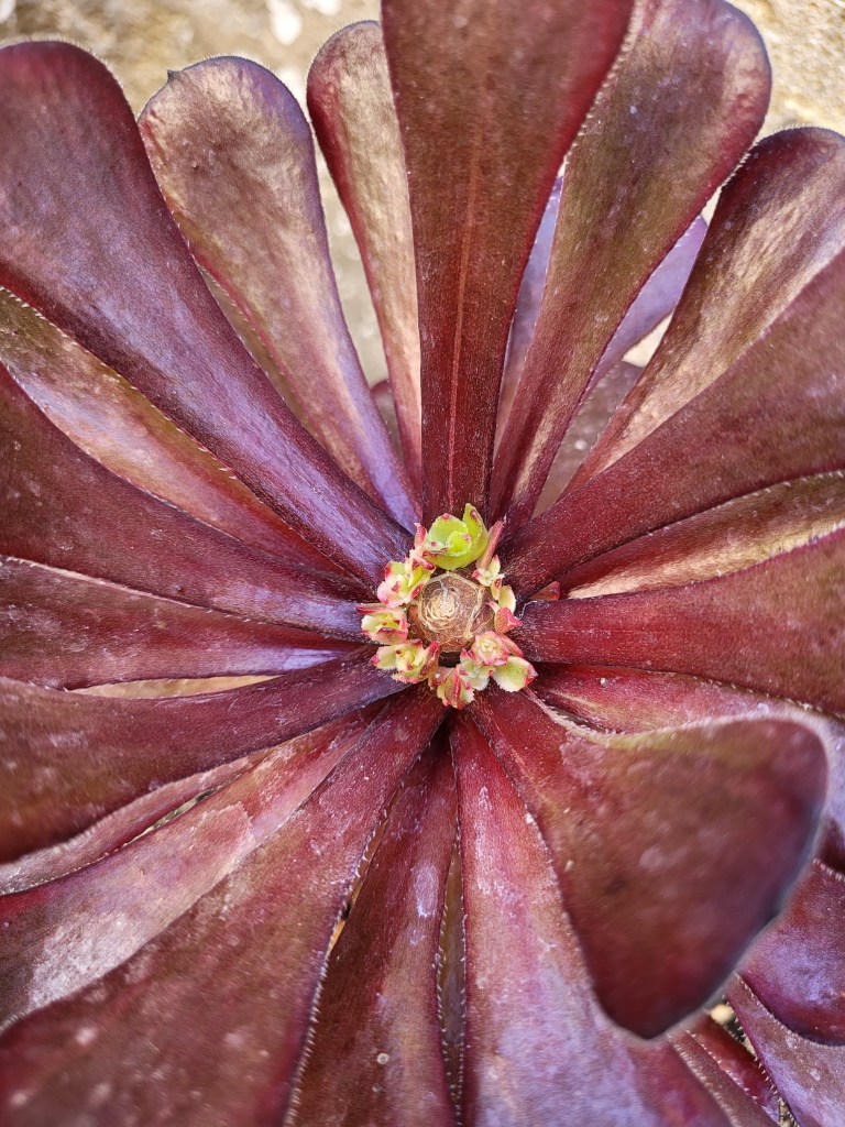Quand un Aeonium fleurit, la rosette meurt. Quand un Aeonium monocarpique fleurit (ex. hierrense, urbicum et escobarii la plupart du temps, pseudourbicum, tabuliforme…), vu qu’il ne possède qu’une seule et unique rosette, l’Aeonium meurt. Il assure sa descendance grâce aux très nombreuses graines que contient son inflorescence.