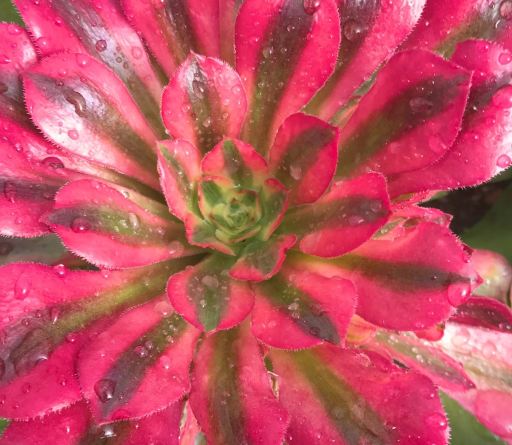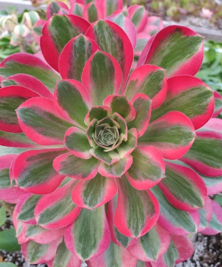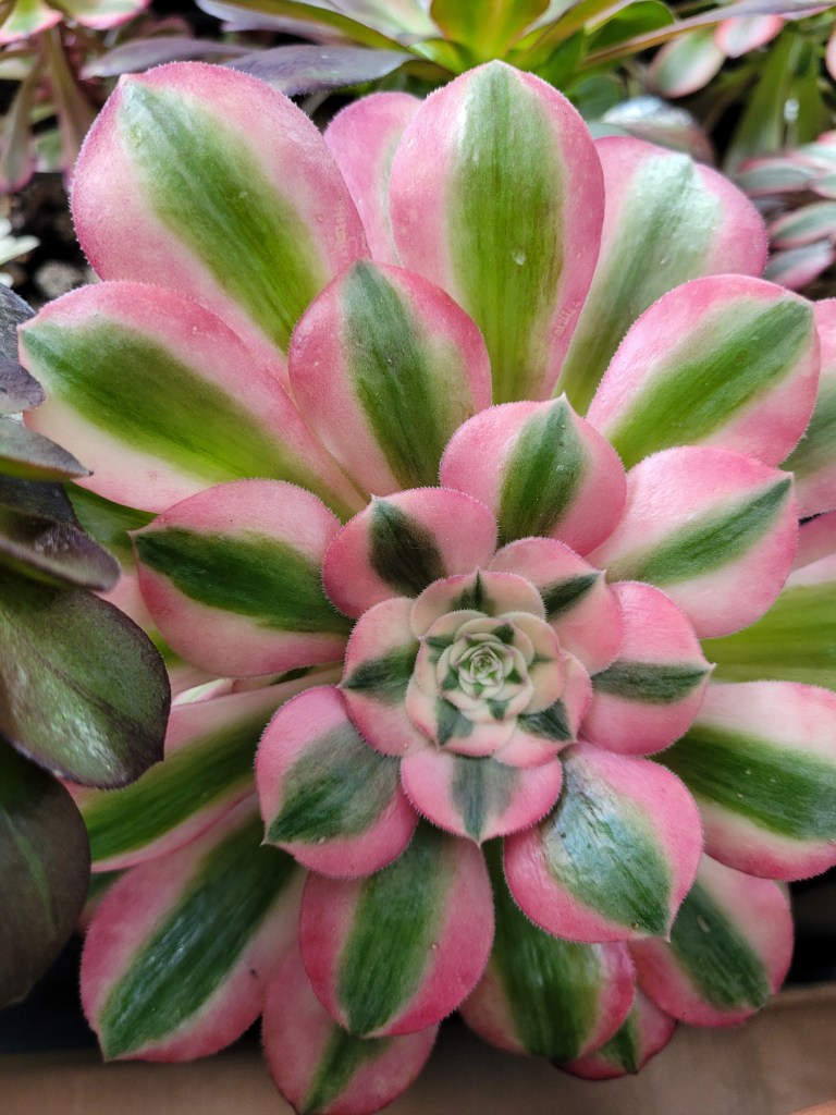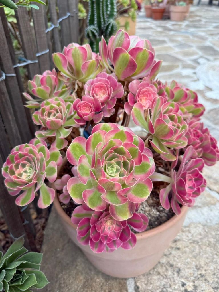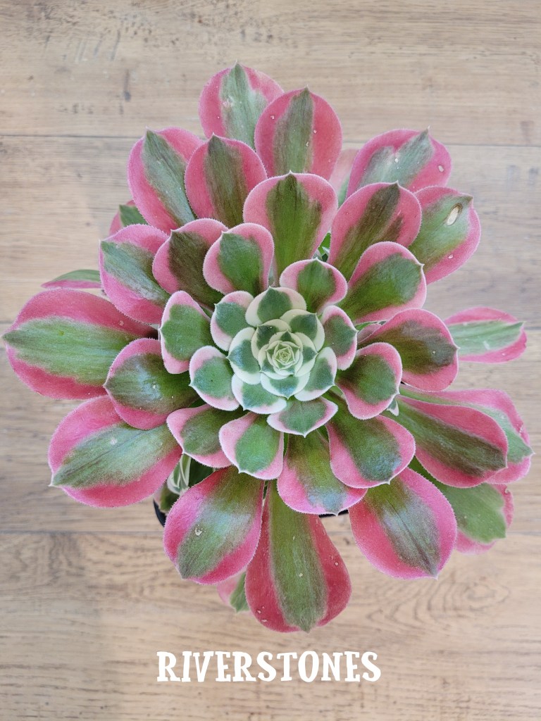 DESCRIPTION : Comme son nom l’exprime parfaitement, Pink Witch est un Aeonium arbustif rose qui garde sa variégation toute l’année qui se caractérise par trois teintes caractéristiques (une couleur rose, vert et crème (blanc cassé tirant vers le jaune)). Au cœur de la rosette, on y retrouve principalement le crème et le vert, et sur les feuilles plus anciennes, une ligne verte centrale plus ou moins large est accompagné de chaque côté d’une bande rose avec plus ou moins de dégradée suivant l’exposition et la température. Sa teinte vire au rose pâle en période de croissance et fonce petit à petit plus la luminosité et la chaleur augmente. Il ne devient jamais vraiment rouge par contre comme beaucoup d’autres aeonium. Sa texture est duveteuse comme l’aeonium Blushing Beauty. Il a une bonne capacité à rejeter et sa pousse est plutôt rapide et n’est pas particulièrement fragile (sauf au gel comme tous les aeonium).