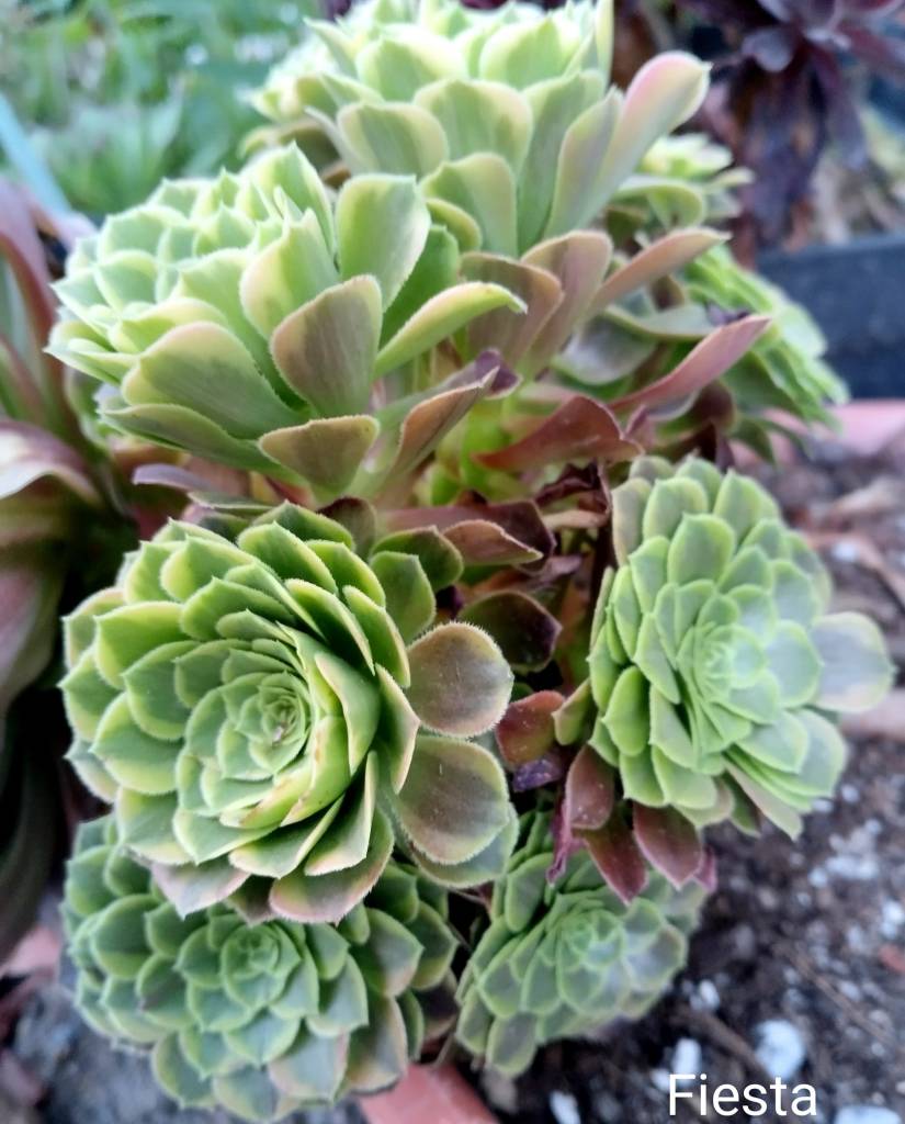 DESCRIPTION : L’Aeonium ‘Fiesta’ est un Aeonium arbustif variegata qui se caractérise par trois teintes caractéristiques (rouge, vert et jaune). Au cœur de la rosette, on retrouve principalement un vert sur le centre de la feuille et un vert plus clair qui peut tirer vers le jaune sur les côtés. Quand la feuille vieillit, une couleur rouge apparaît d’abord sur le bout de la feuille puis gagne petit à petit toute la feuille.