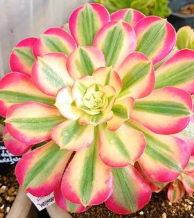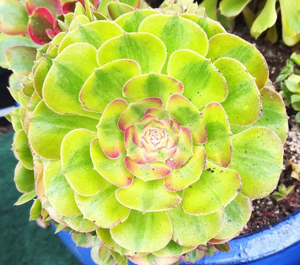 ORIGINE : Issu de la mutation de l’Aeonium ‘Verna’ qui est lui même une mutation de l’Aeonium ‘Blushing Beauty’.