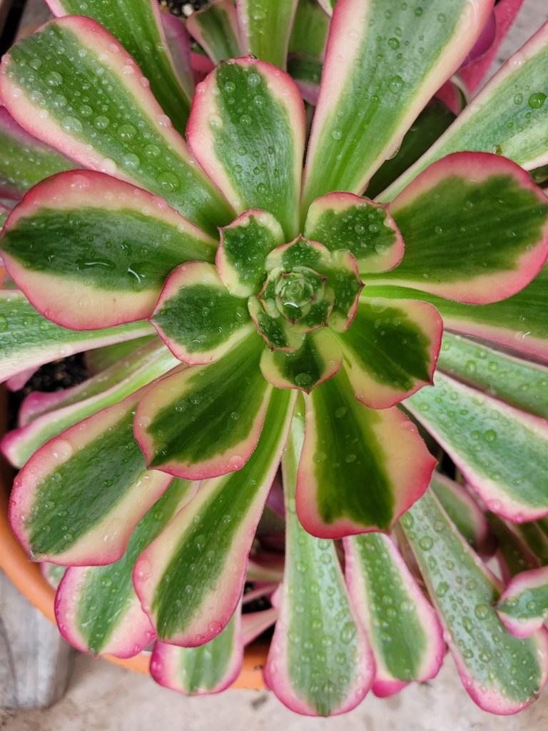 DESCRIPTION : L’Aeonium ‘Medusa’ est un Aeonium arbustif variegata issu de l’Aeonium ‘Velour’. Le cœur de la rosette est lumineux, constitué d’une ligne verte centrale bordé d’une couleur crème. En plein hiver lorsque la luminosité est faible, son feuillage est constitué d’une bande centrale de couleur verte plus ou moins foncé avec une bande de chaque côté de couleur crème avec néanmoins toujours une petite touche de rouge plus ou moins marqué.