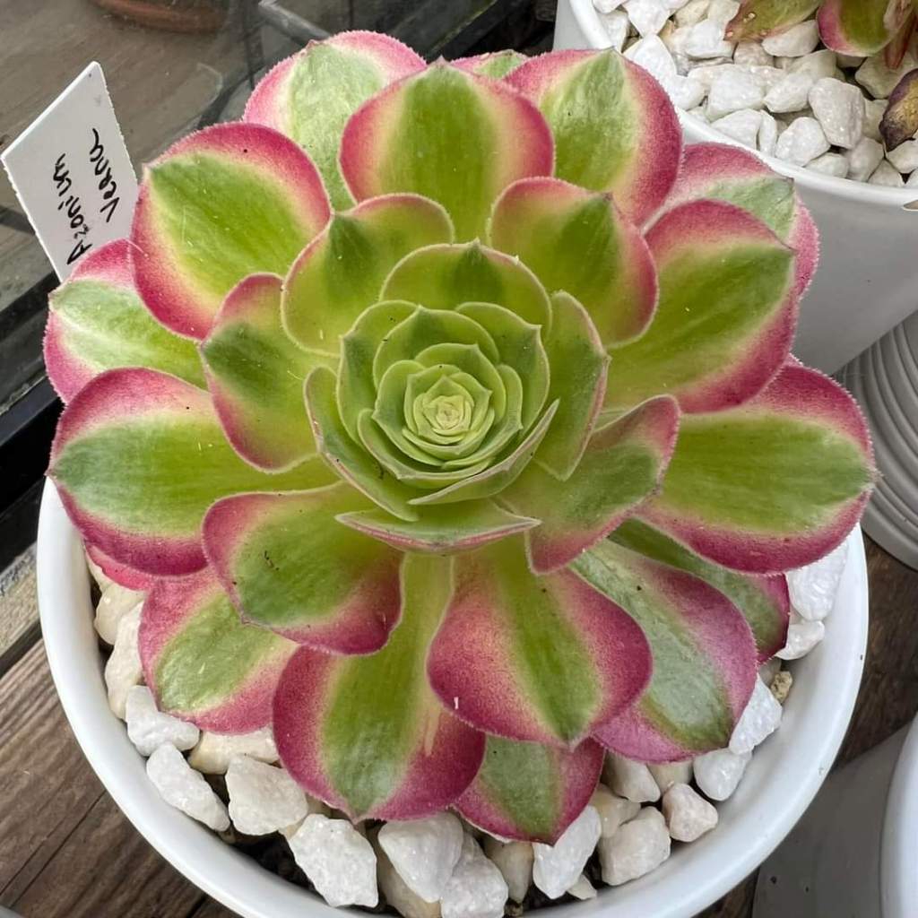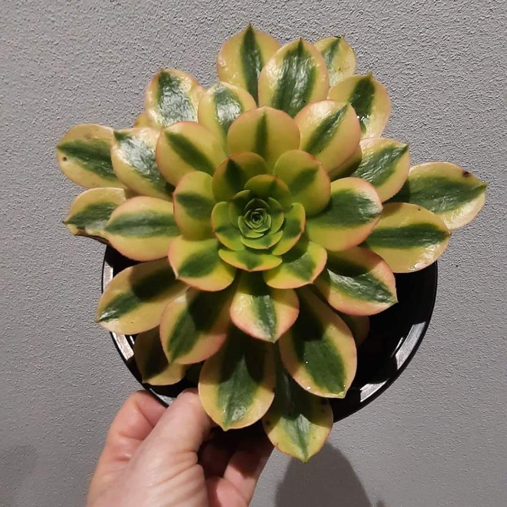 Laissez moi vous raconter celle de l’Aeonium ‘Verna’, un des plus beaux variegata qui existent à mes yeux. Ces informations proviennent principalement de Xiaofei, un producteur et créateur chinois d’Aeonium variegata de la région de Kunming qui a lui-même obtenu ces informations de M. Hu Yu et de Zhizhuo Gardening qui ont développé et multiplié cet Aeonium à ces débuts.