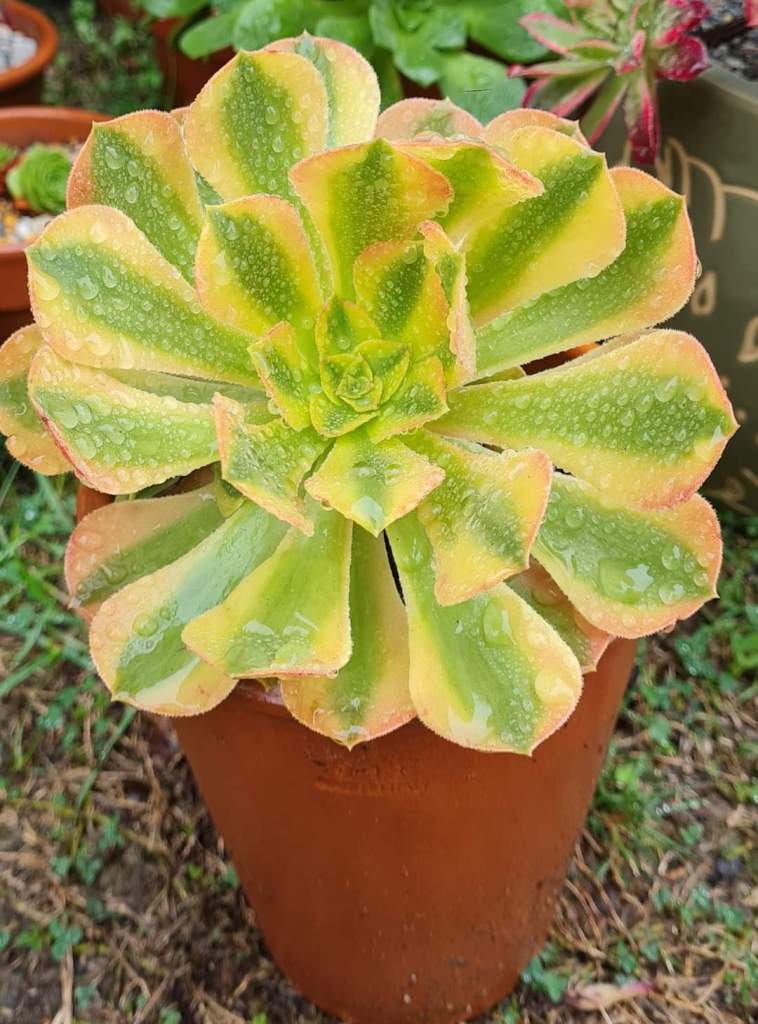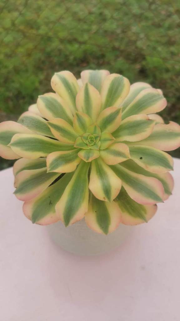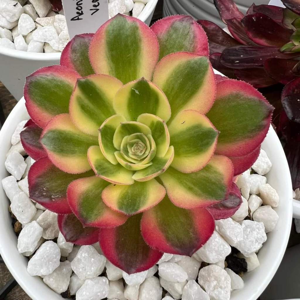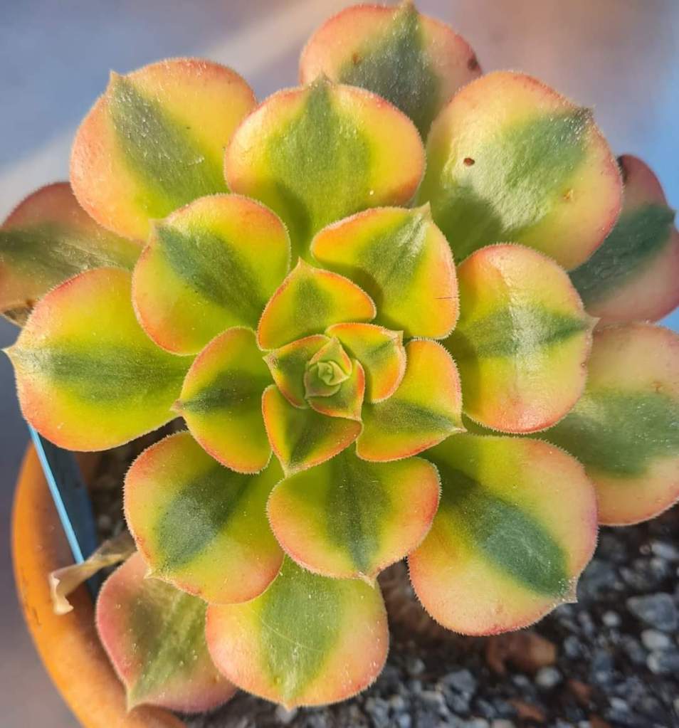 DESCRIPTION : L’Aeonium Verna est un Aeonium arbustif variegata issu de l’Aeonium Blushing Beauty. En plein hiver lorsque la luminosité est faible et les températures fraîches, son feuillage est constitué d’une bande centrale de couleur verte avec une bande de chaque côté de couleur jaune/crème qui se teinte facilement d’une jolie teinte oranger dès qu’il prend un peu plus de soleil.