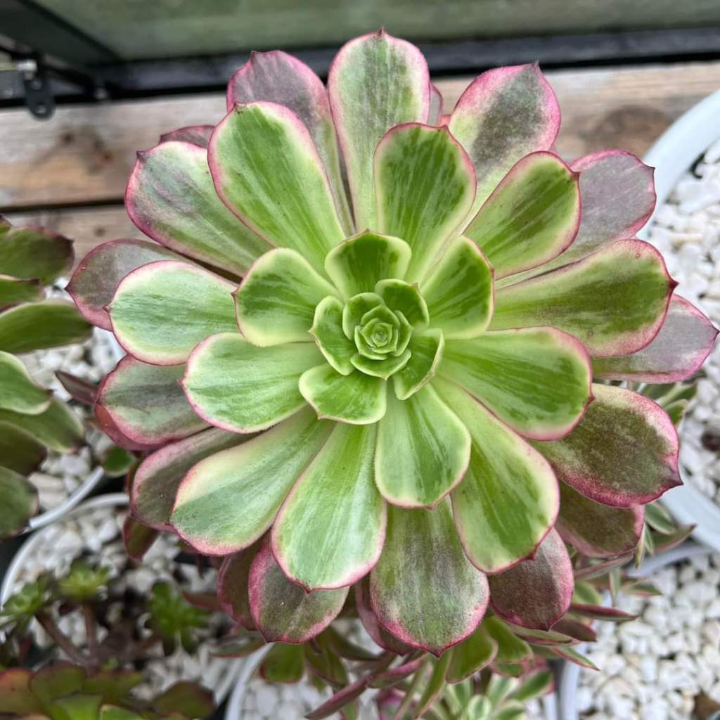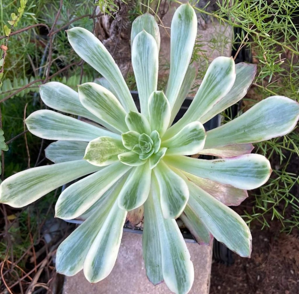 DESCRIPTION : L’Aeonium ‘Wedding Dress’ est un Aeonium arbustif variegata issu de la mutation de l’Aeonium ‘Medusa‘.