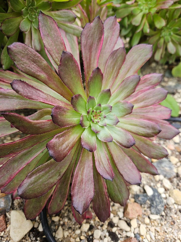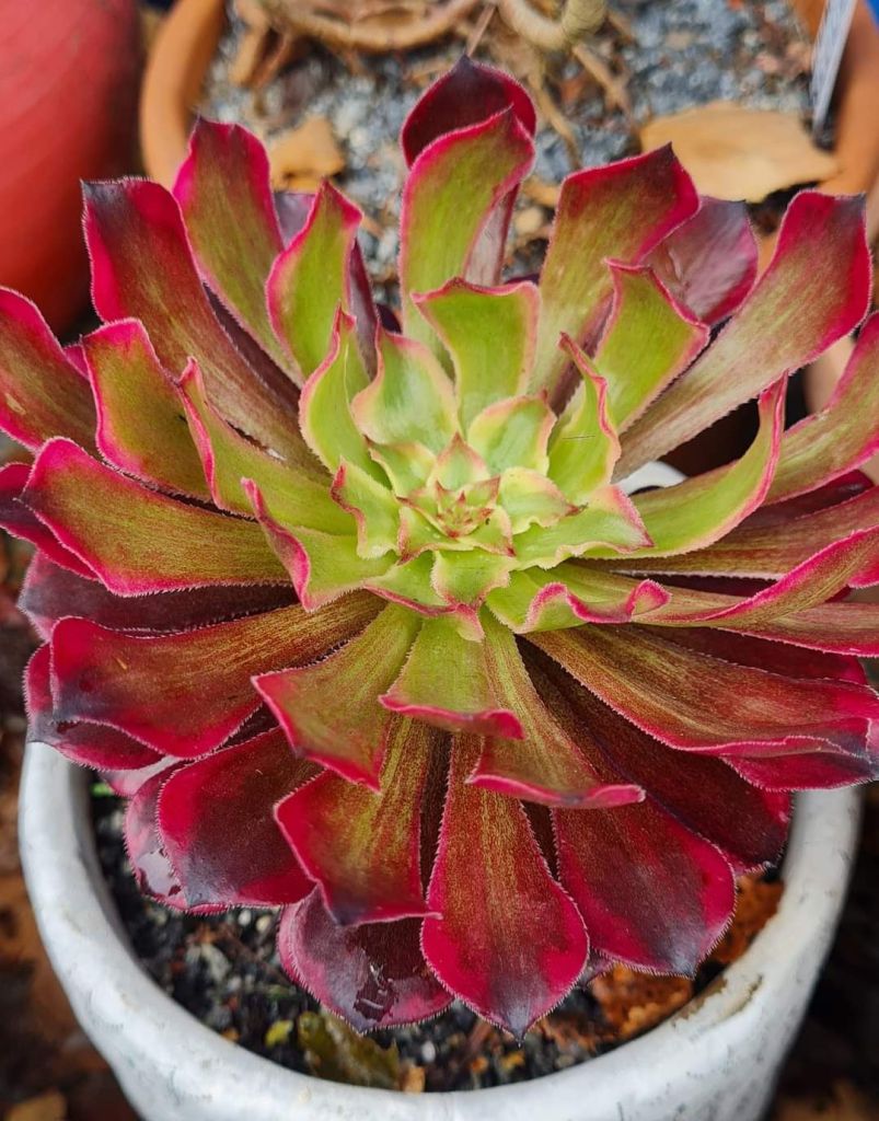 Une des caractéristiques de l’Aeonium ‘Snow Girl’ vient de ses feuilles qui se tordent et s’enroulent en été comme des vagues pour lui donner une allure magnifique.