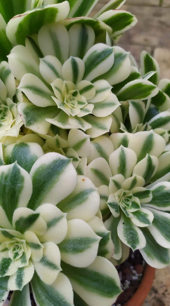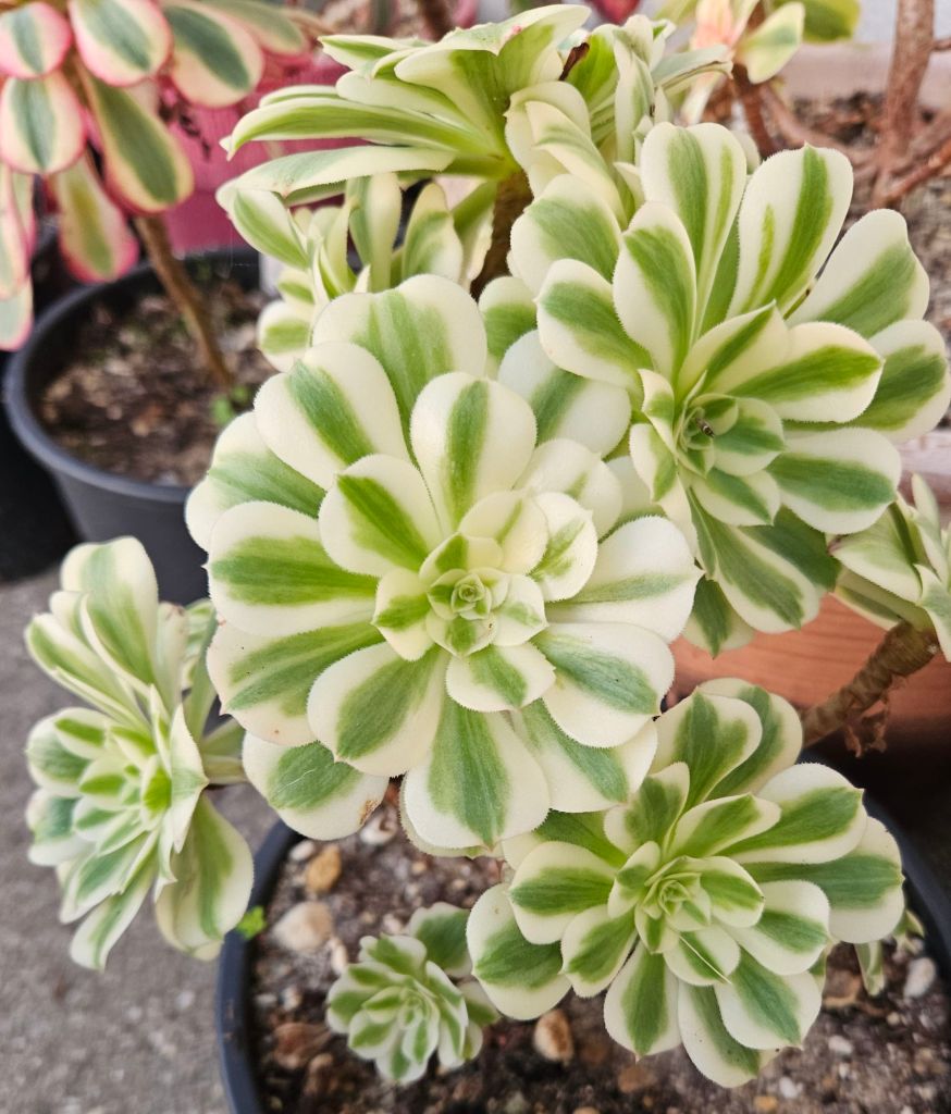Il se caractérise par un feuillage constitué d’une large bande centrale de couleur verte plus ou moins foncé avec une bande de chaque côté de couleur blanc ou crème. Cet Aeonium est très stable et n’évolue que très peu au fil des saisons.