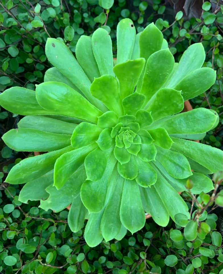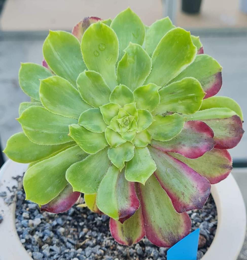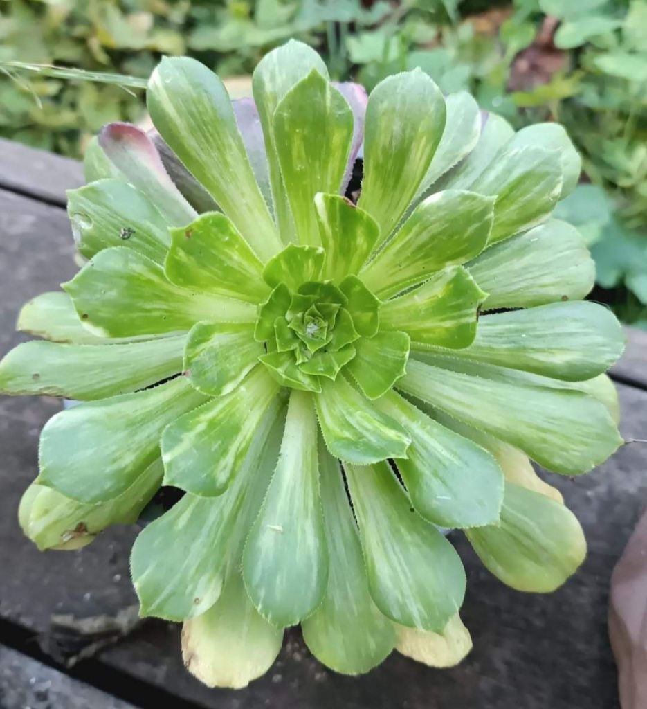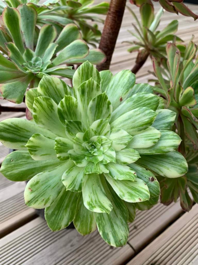 DESCRIPTION : L’Aeonium ‘Meteor’ est un Aeonium arbustif variegata issu de la réversion de l’Aeonium ‘Pink Daisy‘. Il a un feuillage vert avec des marques blanches et peut avoir des lignes centrales rouge/vert foncé. Il n’évolue que peu au fil des saisons. Il est issu de la réversion de l’Aeonium ‘Pink Daisy’. Le retour vers Glowworm ou Pink Daisy est possible même s’il est peu courant.