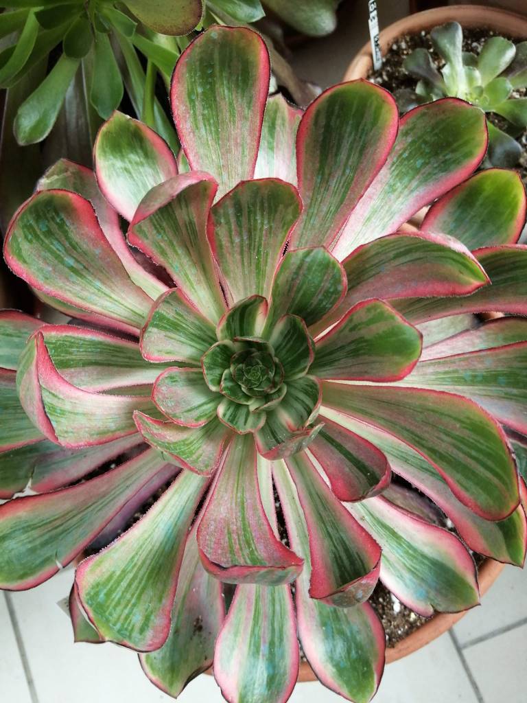 DESCRIPTION : L’Aeonium ‘Voodoo Silk’ est un magnifique et encore rare Aeonium variegata issu de la mutation de l’Aeonium ‘Voodoo’. Pendant l’hiver l’Aeonium ‘Voodoo Silk’ a de magnifique zébrures blanches et vertes sur ces feuilles et seul les bordures ont des teintes roses/rouges. En situation poussante, les feuilles sont plutôt fines et longues. En période estivale et sous forte luminosité, seul le cœur de la rosette garde ses zébrures blanches et vertes et les feuilles plus anciennes rougissent pour ne garder qu’un mince filet vert au centre. Les feuilles ont aussi tendance à s’élargirent. Sans eau et sous forte température, l’Aeonium entre alors en dormance et les feuilles ont tendance à foncer et prendre des teintes noires.