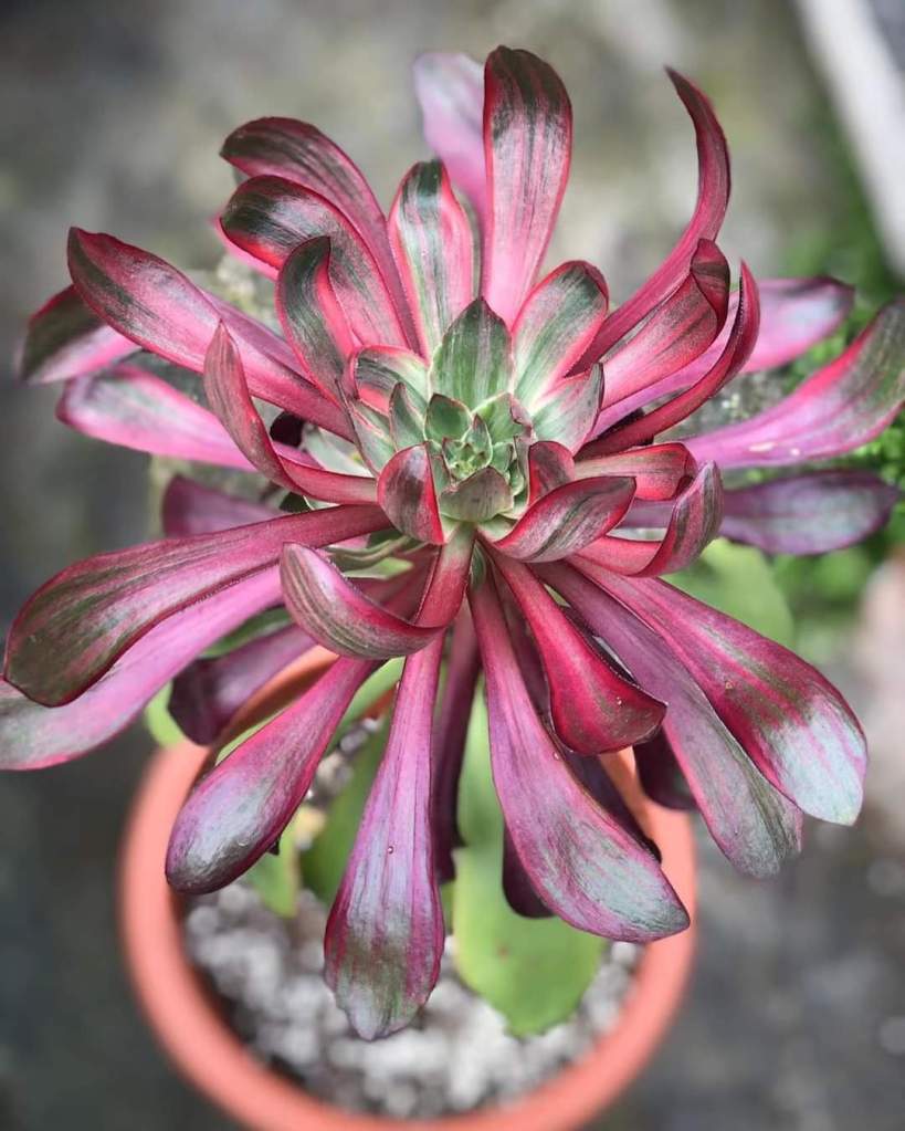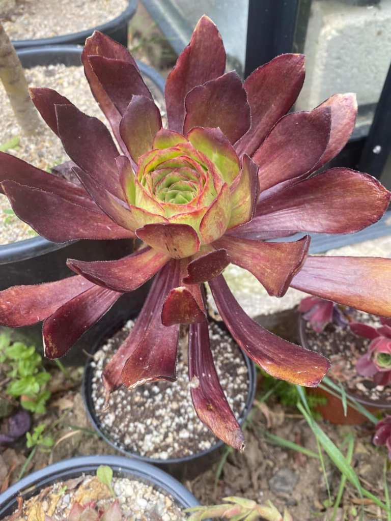 Cet Aeonium n’est pas particulièrement fragile, a une pousse active mais rejette peu comme tous les Aeonium ‘Voodoo’.
