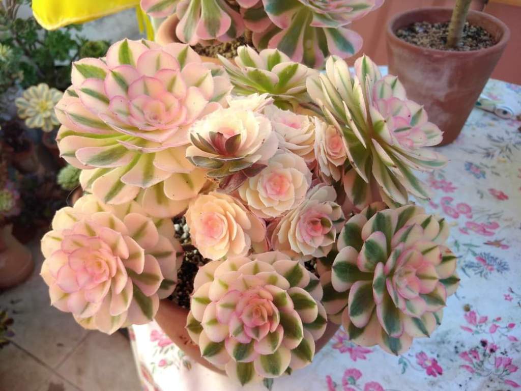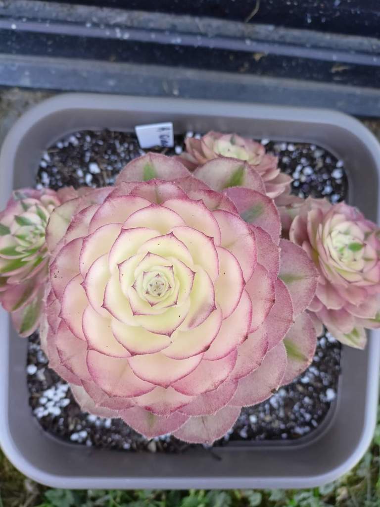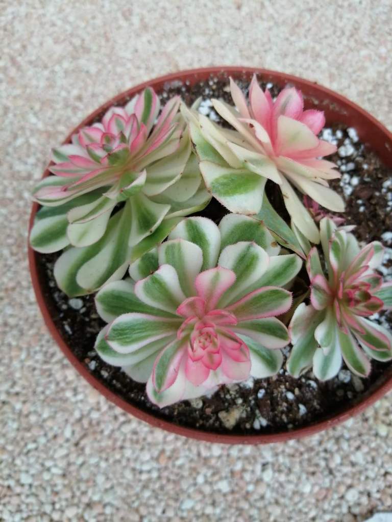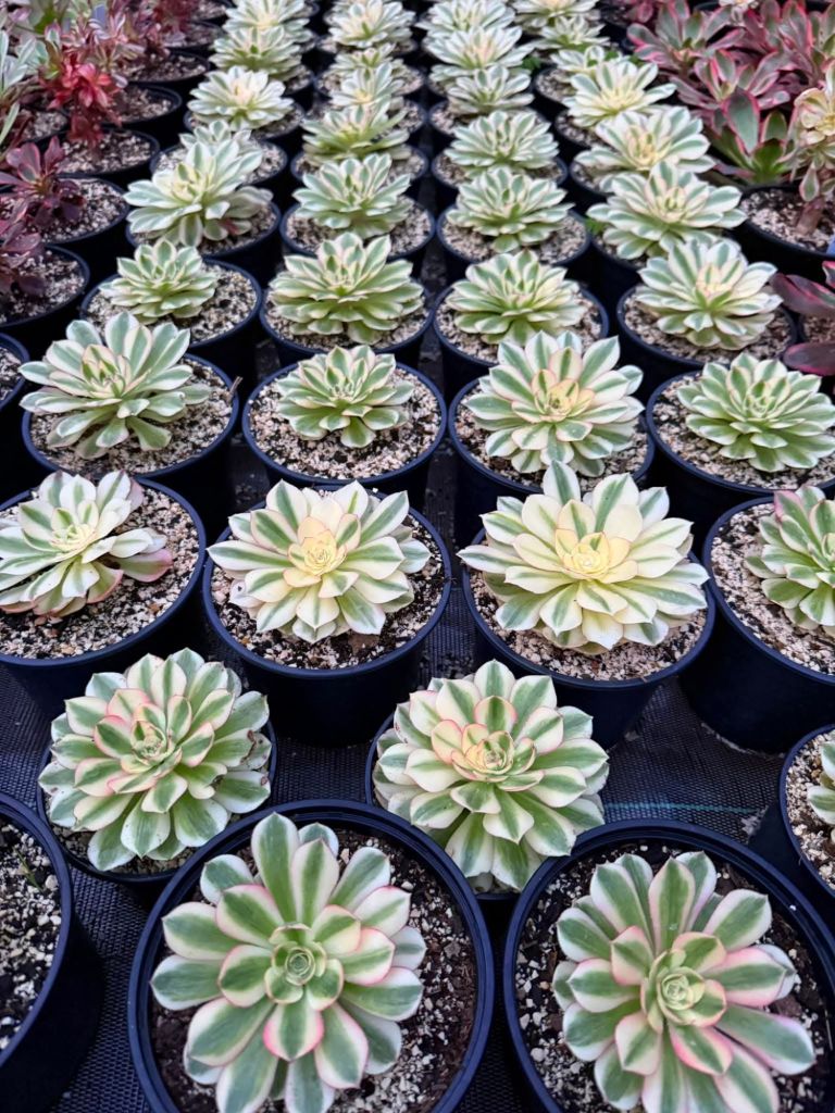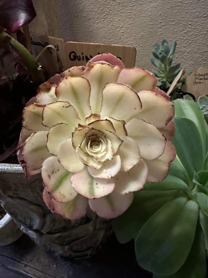 Remarque : Cet Aeonium a tendance à perdre une grande partie de ses parties vertes (chlorophylle) pour devenir quasi albinos. Ce qui engendre une pousse lente et une plus grande fragilité mais aussi un charme indéniable.