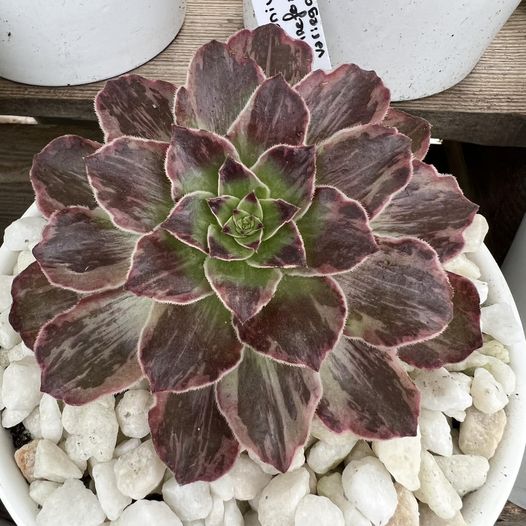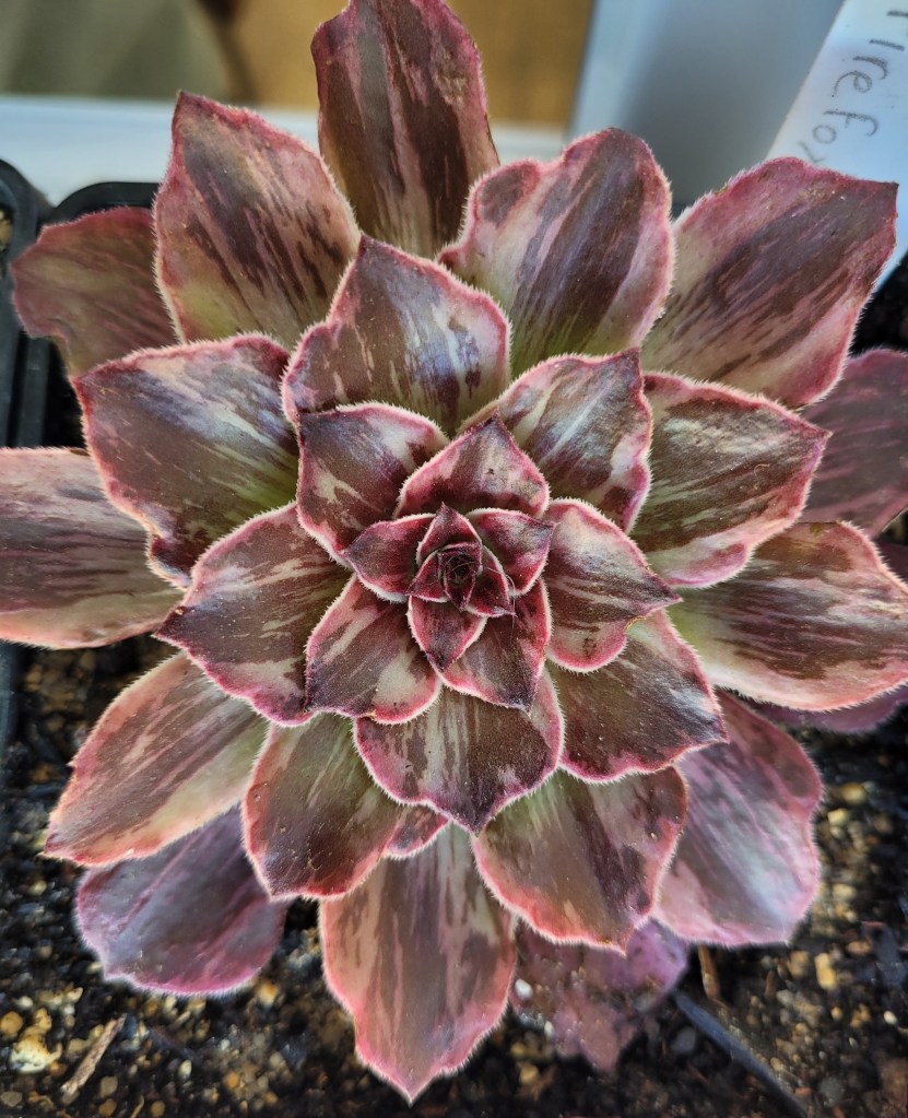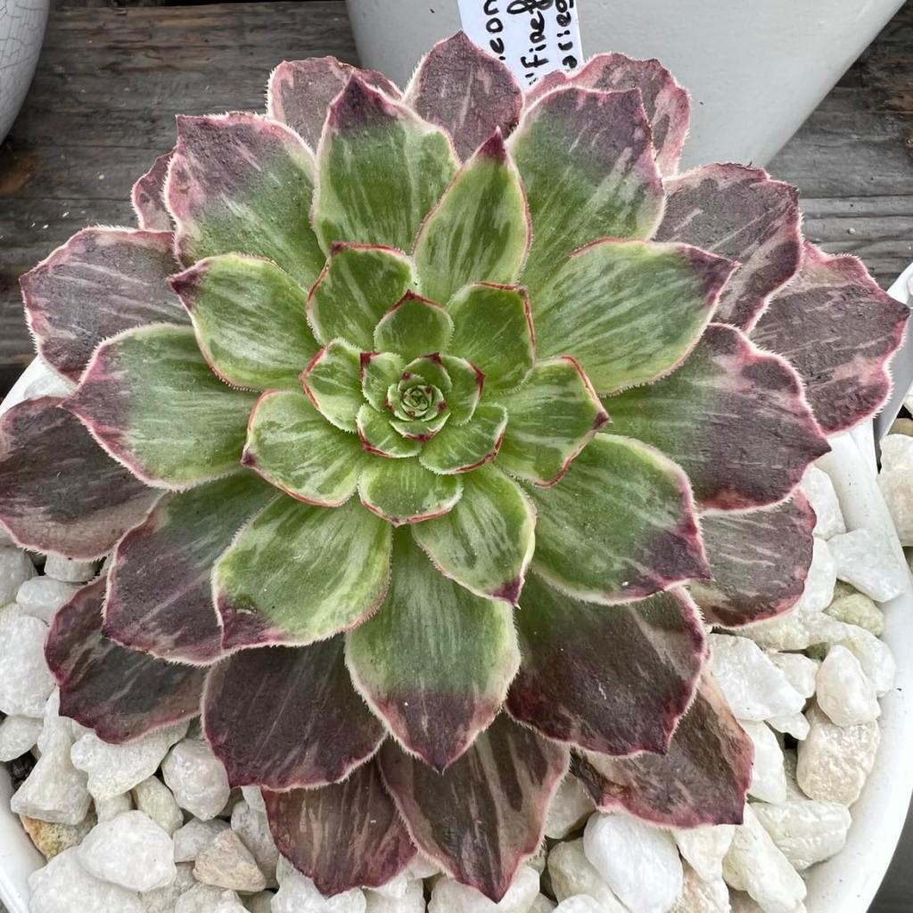 DESCRIPTION : L’aeonium Firefox est un aeonium arbustif variegata issu de la mutation de l’aeonium Madeira Rose (Halloween).