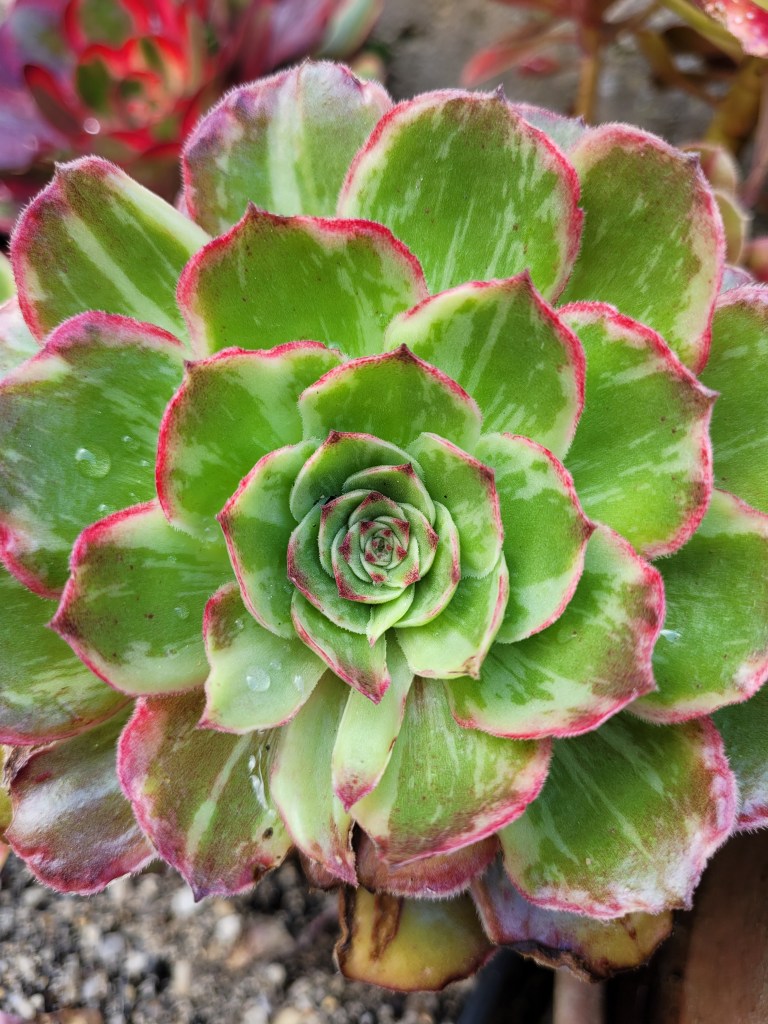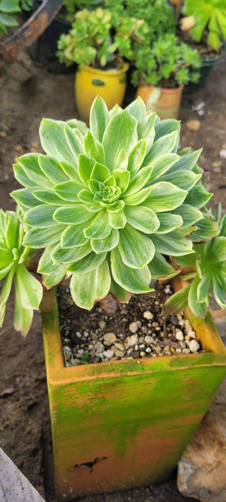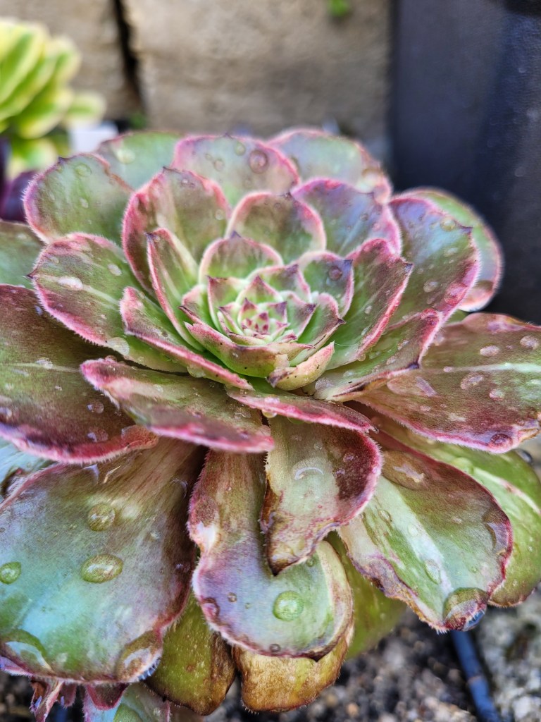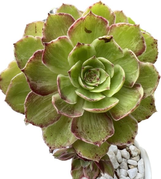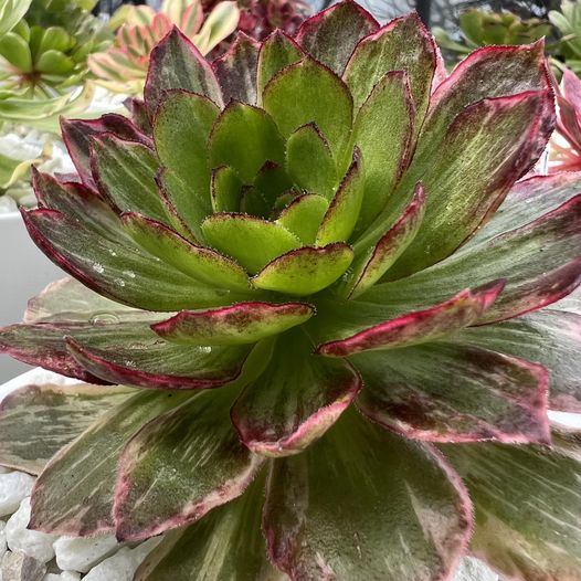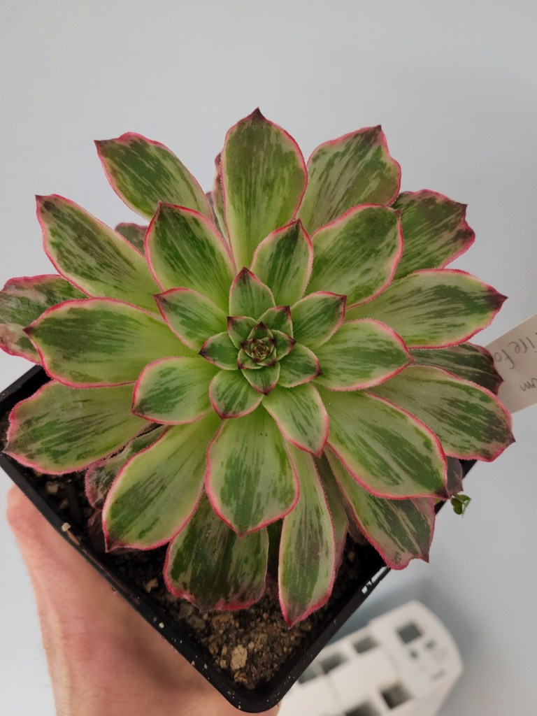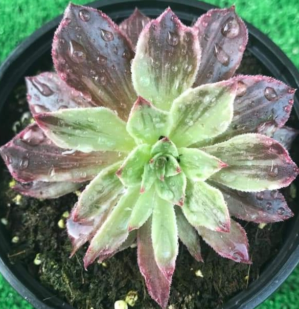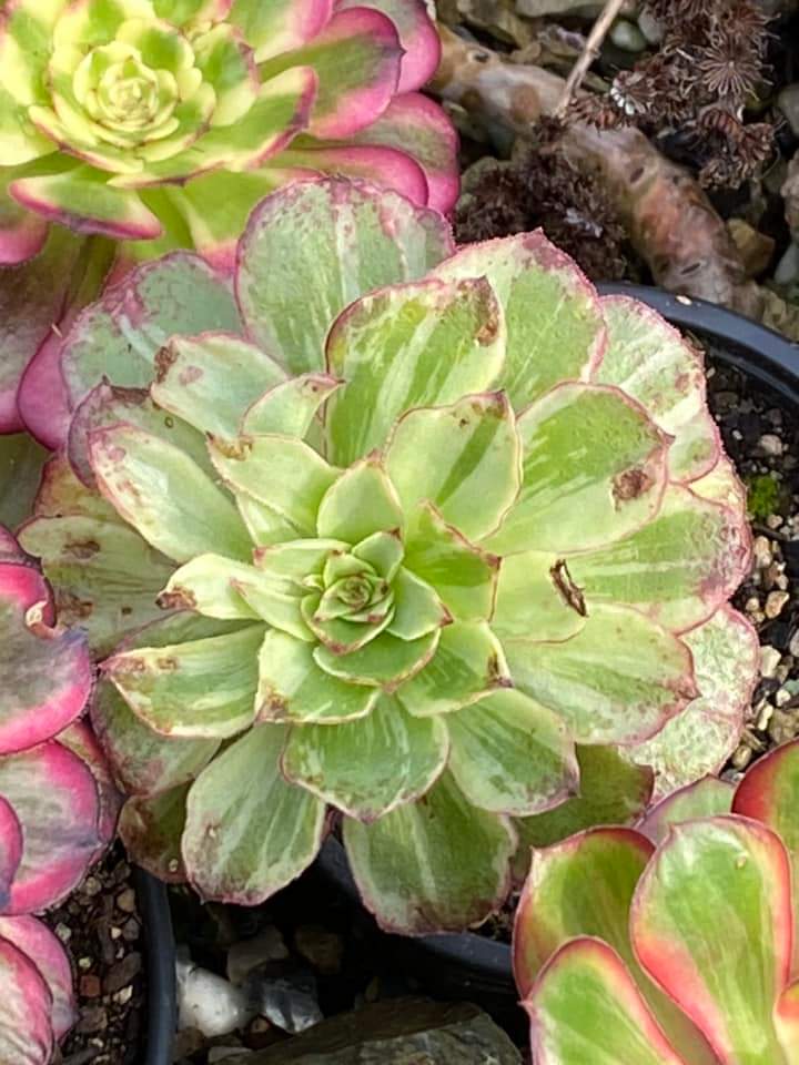 Cet aeonium variegata a une pousse plutôt lente et rejette moyennement. Plutôt fragile comme beaucoup d’Halloween variegata.