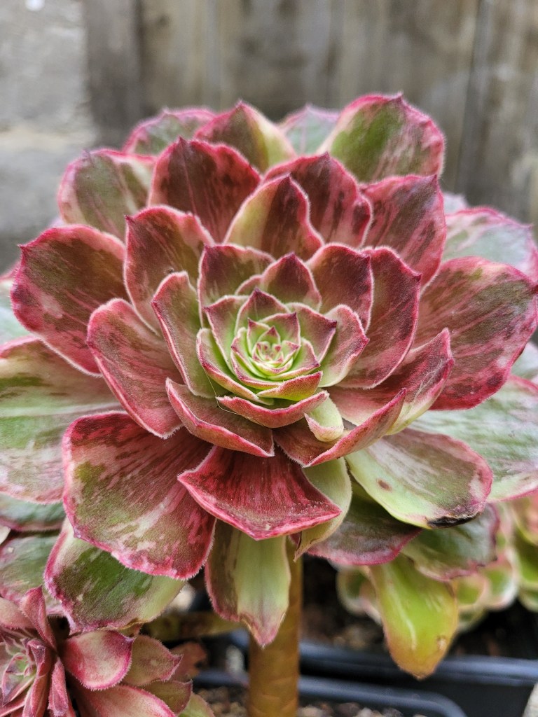 Plus la luminosité et les températures vont monter, plus la couleur rouge va venir recouvrir les feuilles et foncer tout en gardant le plus souvent des stries très marquées, la marque de fabrique de cet aeonium.