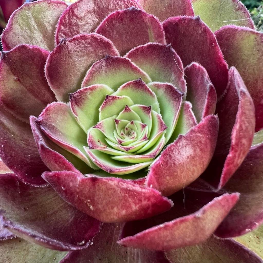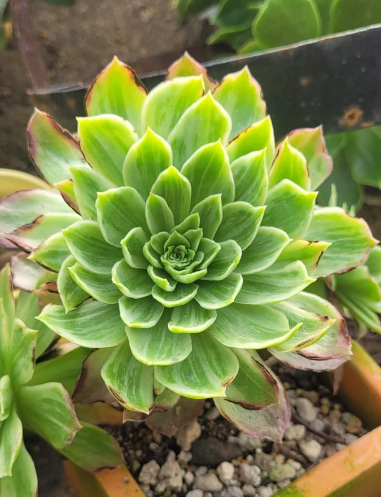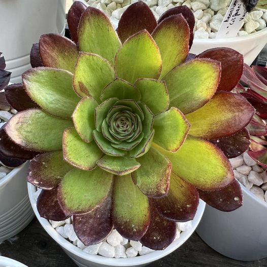 Remarque : Cet aeonium peut aussi parfois perdre quasiment toutes ses stries à certaine période de l’année (voir photos ci-dessous). Je n’ai pas encore identifié cette raison. Est-ce une génétique différente ou est-ce le résultat d’une exposition ou d’un climat particulier ? N’hésitez-pas à venir vers moi si vous avez des éléments explicatifs.