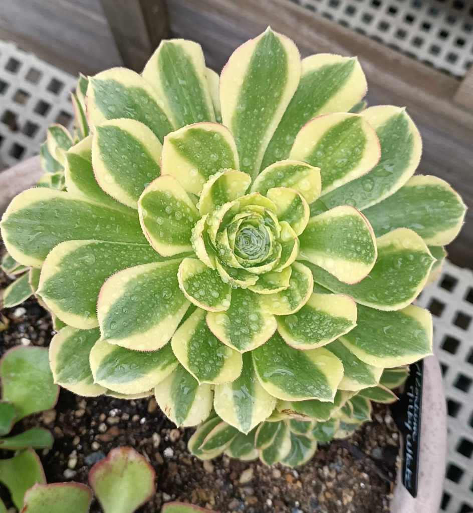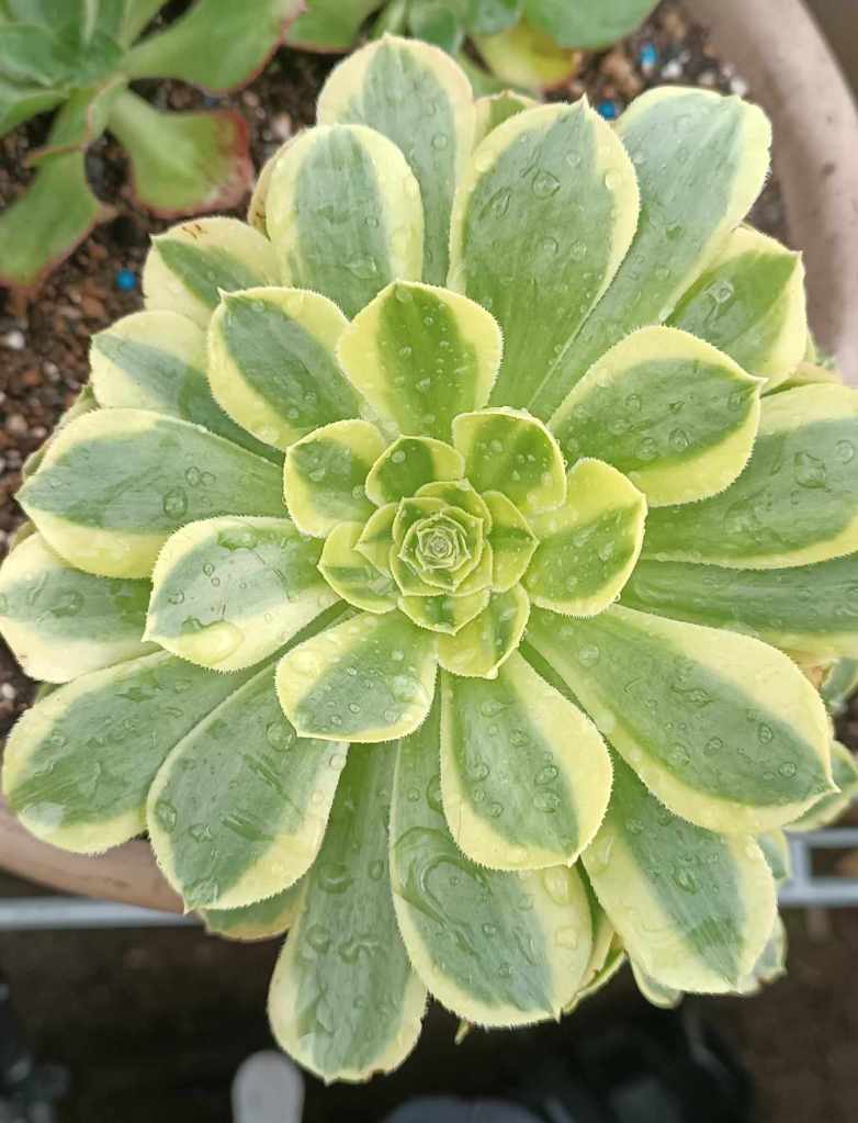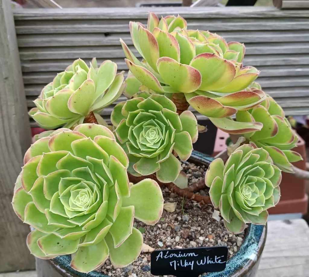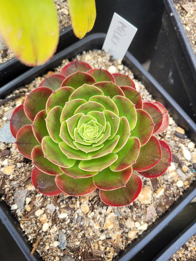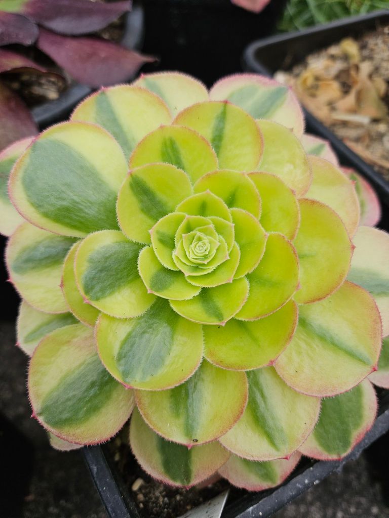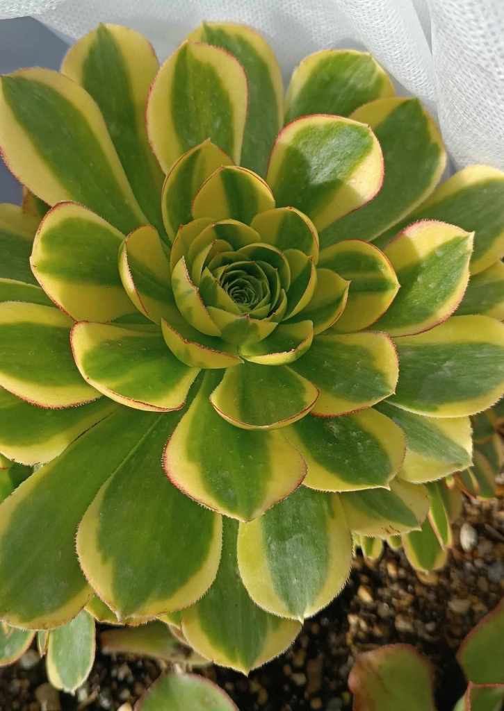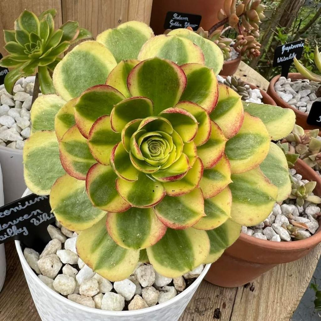 DESCRIPTION : L’Aeonium ‘Milky White’ est un Aeonium arbustif variegata issu de la mutation de l’Aeonium Madeira Rose (Halloween). C’est un Halloween variegata yellow form.