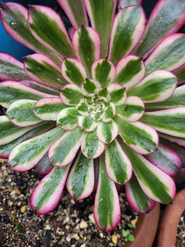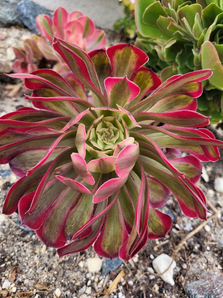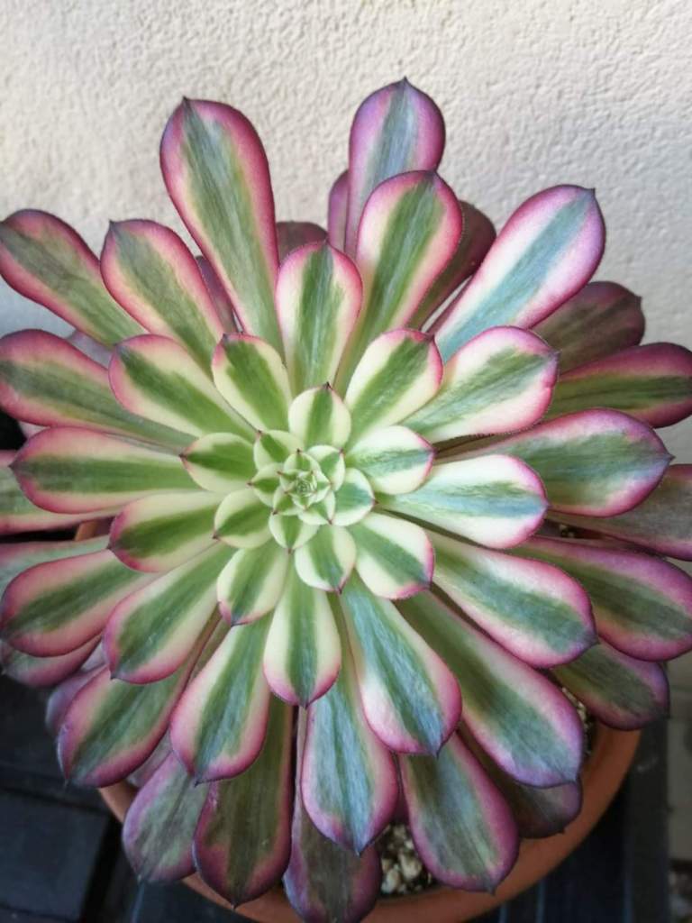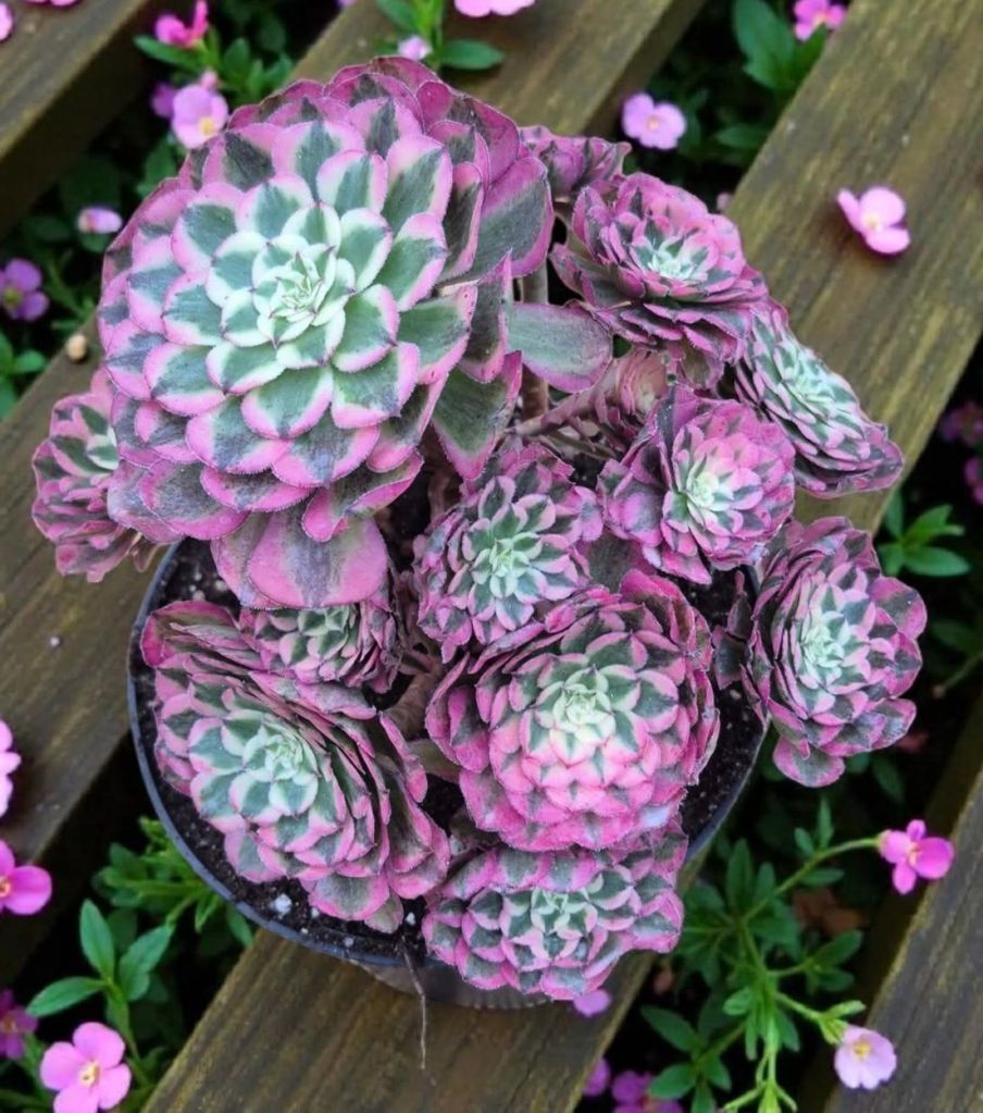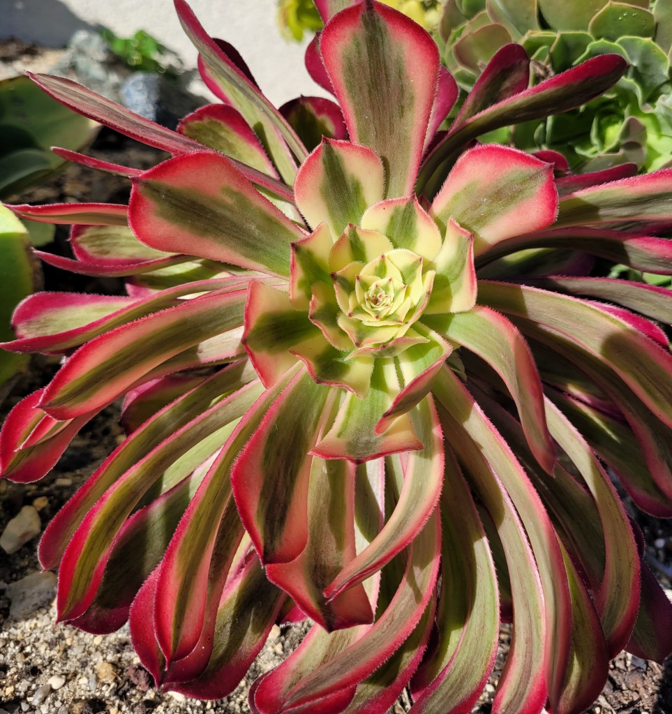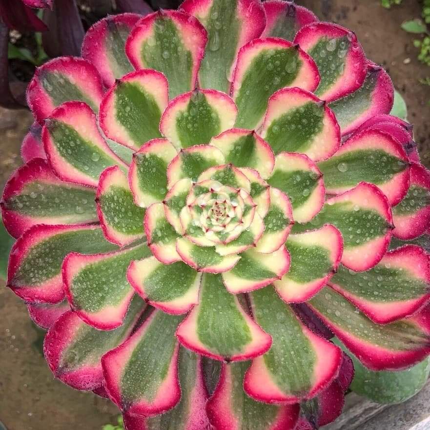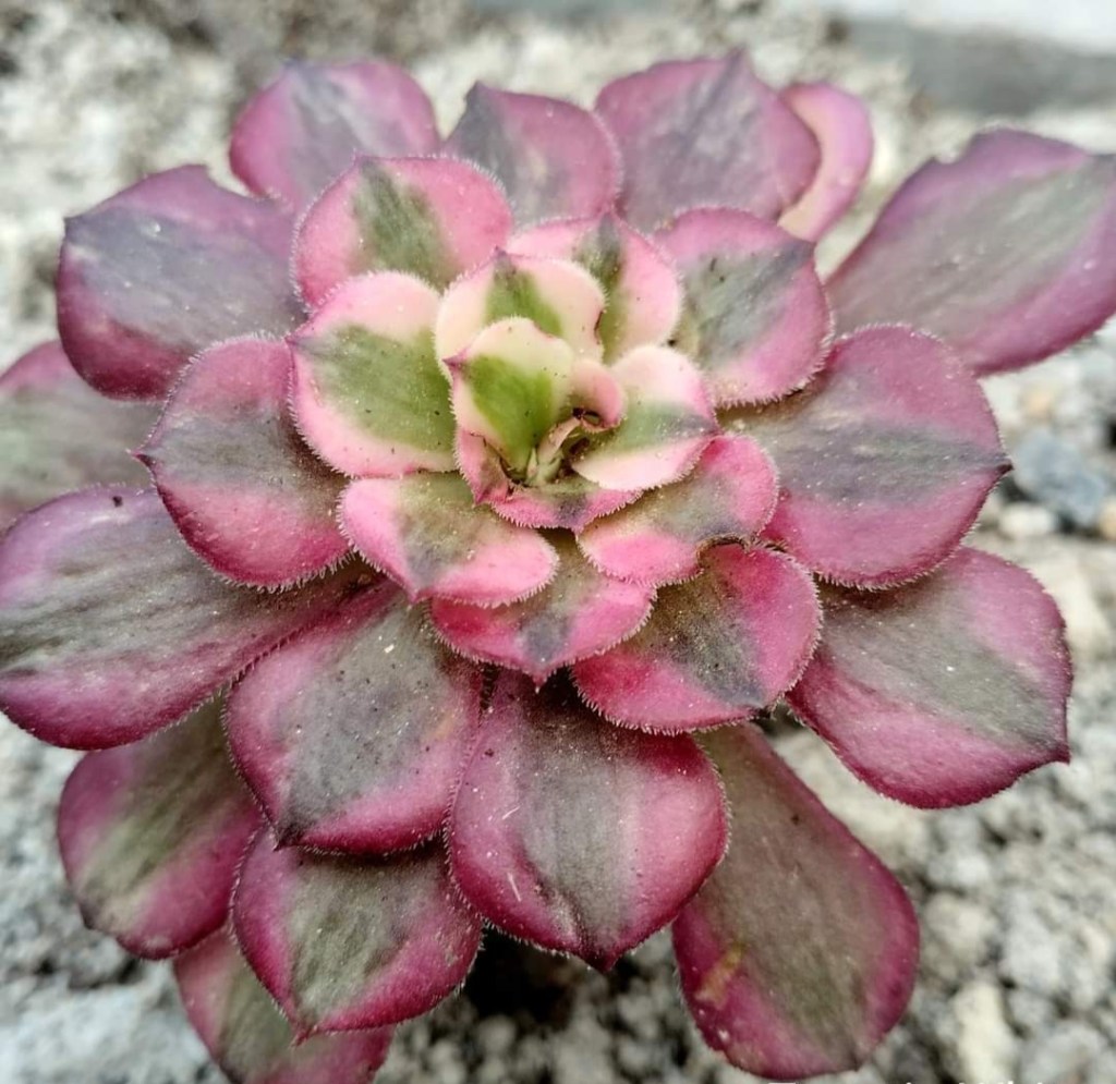 En Ă©tĂ©, lorsque la luminositĂ© est vive, le rose/rouge va devenir rouge vif sur les deux bandes latĂ©rales et le vert centrale va foncer pour devenir noir. Le centre de la rosette (cĆur de pousse) va lui rester toujours vert et crĂšme.