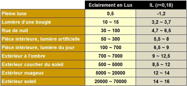 Dans un premier temps il faut bien comprendre que la luminosité dans une maison n’est jamais suffisante (même dans une pièce lumineuse comme je lis souvent dans les groupes de succulentes). Le plus souvent, on constate entre 100 et 300 lux seulement (Un lux est l’éclairement d’une surface qui reçoit, d’une manière uniformément répartie, un flux lumineux d’un lumen par mètre carré. Wikipedia). Pour vous faire une petite idée, je vous ai mis ce petit tableau qui donne des chiffres en lux de différentes expositions. Même à l’ombre à l’extérieur la luminosité est plus forte ! Et je ne parle pas d’un plein soleil où on peut dépasser les 100 000 lux. Vous pouvez vous amuser de façon assez ludique à mesurer les lux dans vos pièces d’intérieur et à l’extérieur avec des applis téléchargeables gratuitement sur vos téléphones portables.
