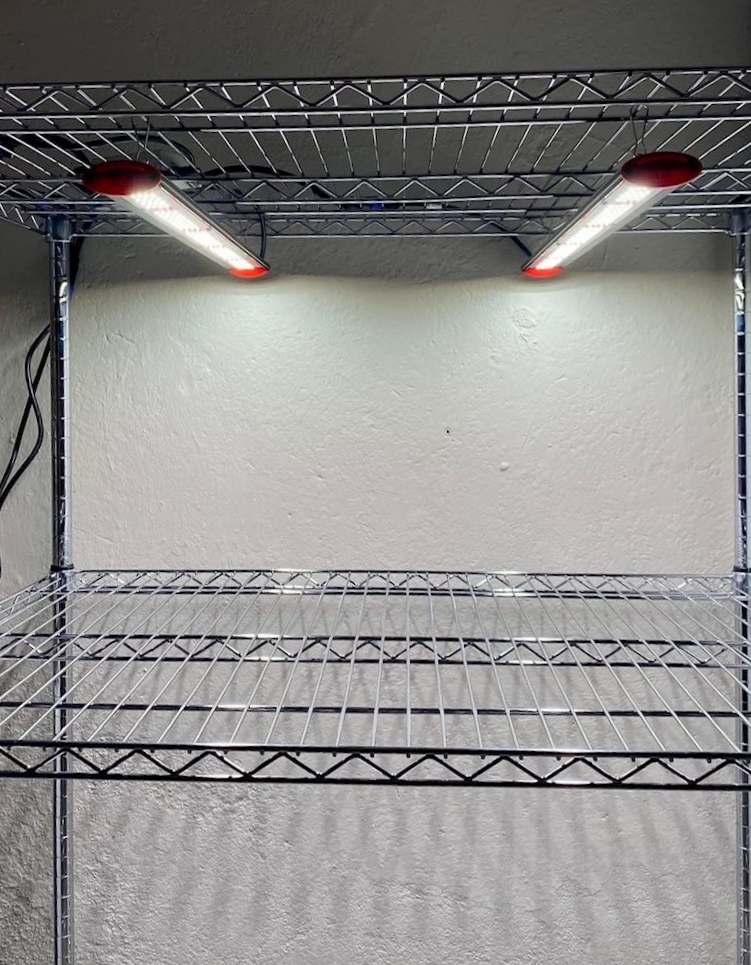 Si votre choix s’est porté sur des lampes LEDs, le plus simple ce sont les étagères, car elles permettent d’accrocher les lampes à l’étage du dessus. Mais il faut la bonne distance entre les étages, pour respecter la distance adéquate entre lampe et plantes, afin que les lampes couvrent la surface à éclairer avec une luminosité homogène.