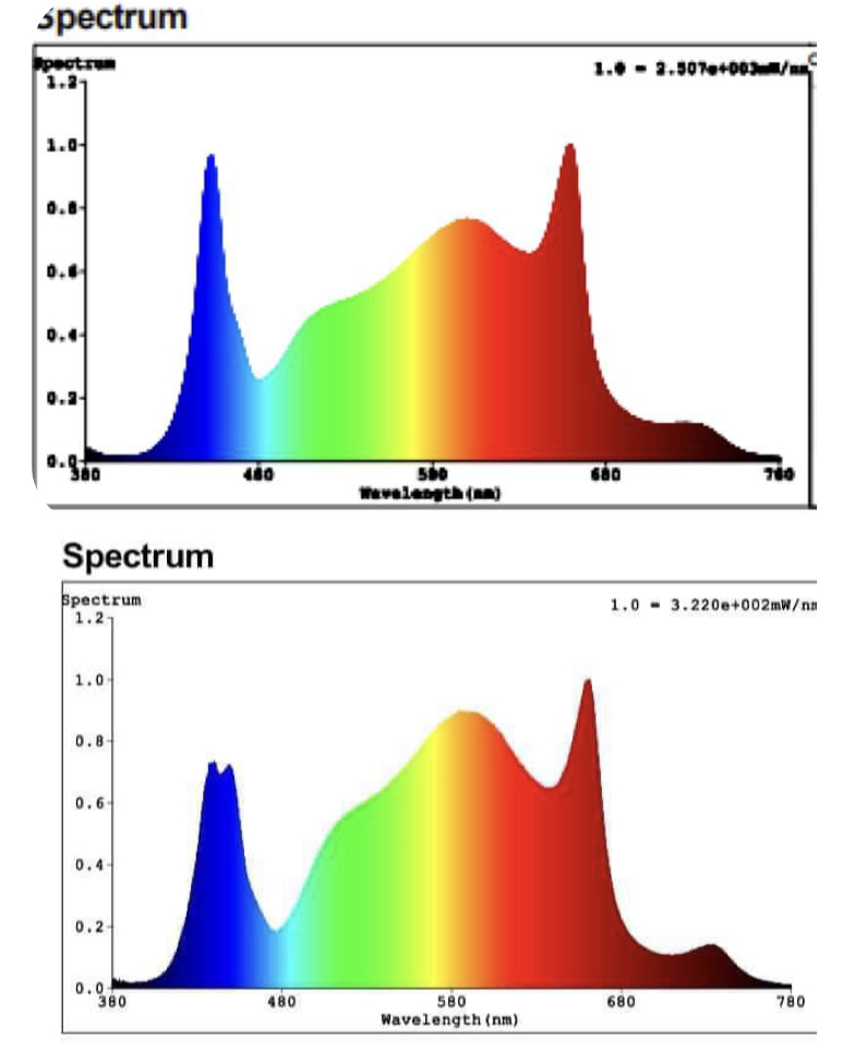 Leur spectre: à noter qu’il n’y a pas le pic rouge à 660nm car les LEDs blanches en émettent assez peu, surtout si elles sont en blanc froid.
