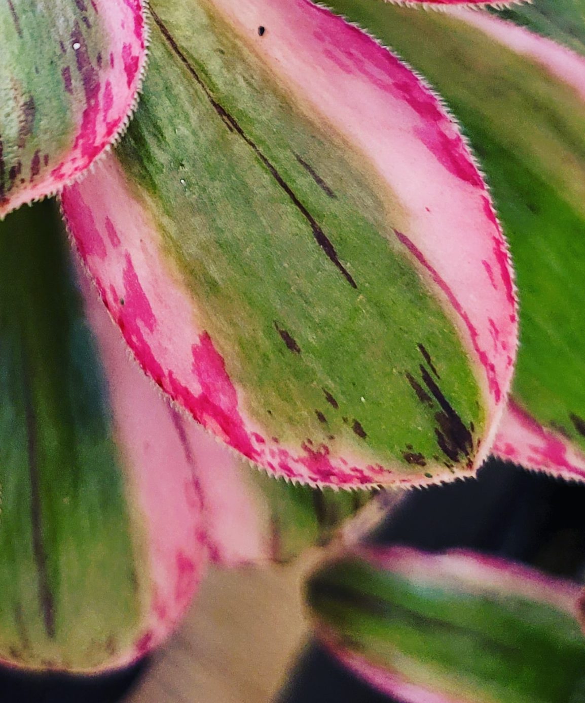 Pour identifier cet Aeonium assez facilement, vous remarquerez l’existence de stries rose sur le feuillage comme sur cette photo en gros plan d’une feuille de « V ».