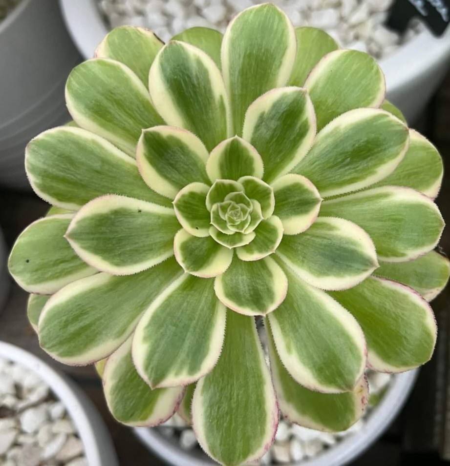 DESCRIPTION : L’Aeonium ‘V’ est un Aeonium variegata issu de l’Aeonium rubrolineatum.