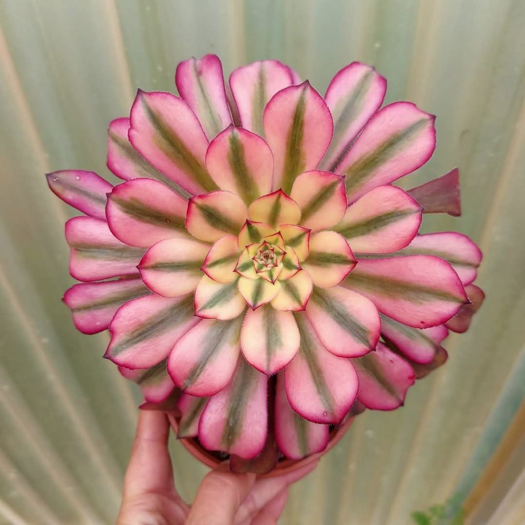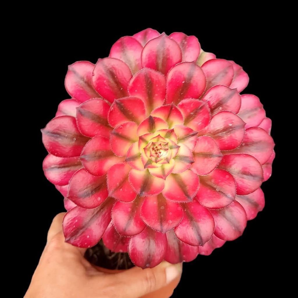 DESCRIPTION : L’Aeonium ‘Hongyan’ est un Aeonium variegata issu de l’Aeonium ‘Mardi Gras’. C’est une des premières mutations observées de ‘Mardi Gras’ et le père de plusieurs autres mutations que l’on retrouve sur le marché comme ‘Meiji’ pour parler du plus connu.
