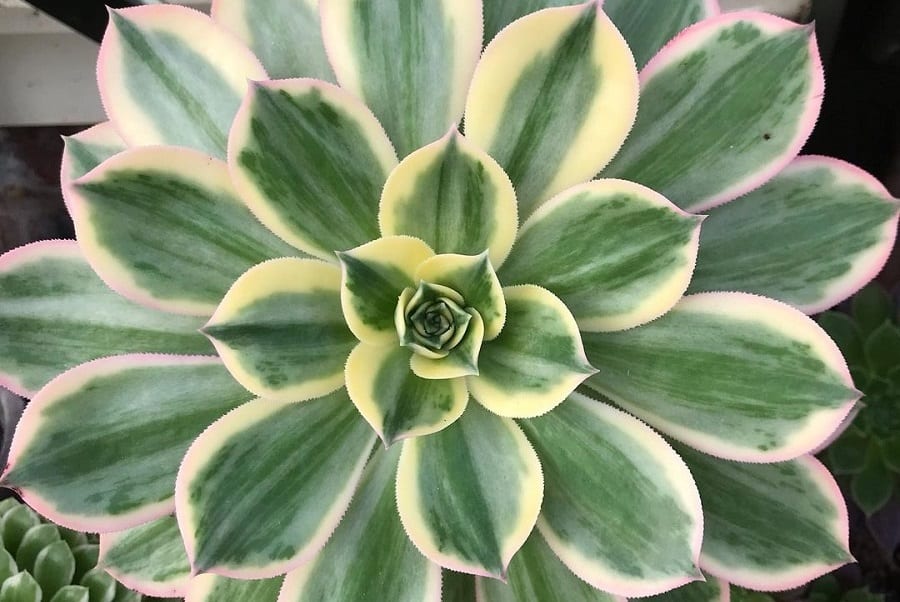 DESCRIPTION : L’Aeonium ‘Emerald City’ est un Aeonium variegata issu possiblement d’une mutation de ‘Sunburst’. Que ce soit en plein hiver ou en été, cet Aeonium est toujours égal à lui-même. Il possède de jolies stries grises argentées sur son feuillage vert ce qui le rend très original et vraiment différent des autres variegata qui existent actuellement. Ses feuilles sont assez dodues.