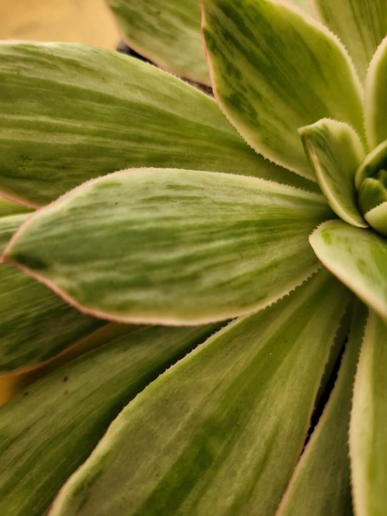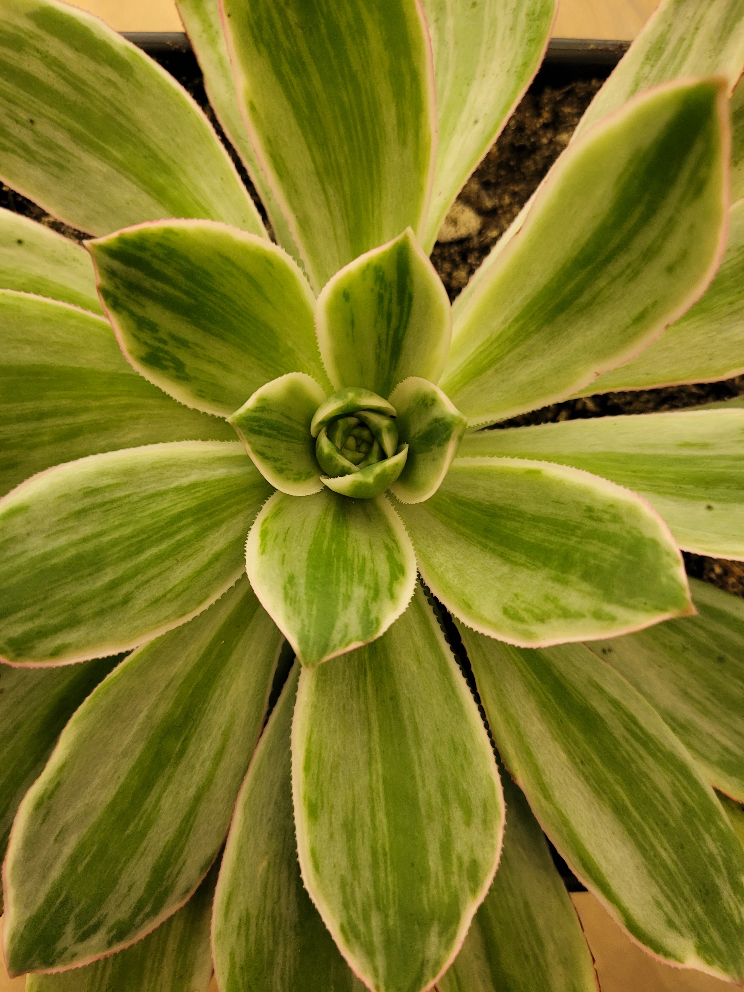 ORIGINE : Il est probable qu’il soit issu d’une mutation de l’Aeonium ‘Sunburst’ et donc de l’Aeonium davidbramwelli. Il est vendu par les producteurs chinois soit en tant que urbicum variegata, soit en tant que percaneum variegata mais il ne ressemble ni à l’un, ni à l’autre.