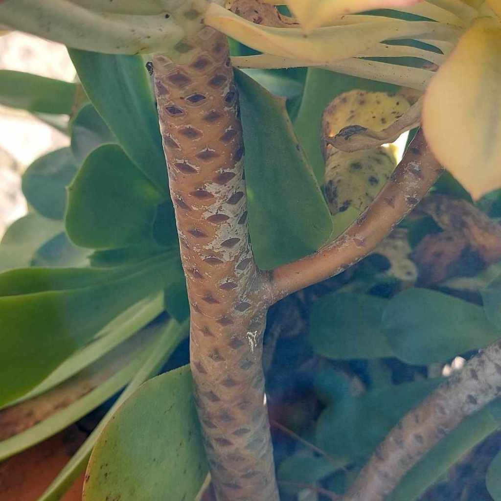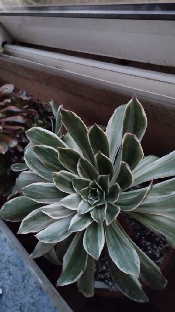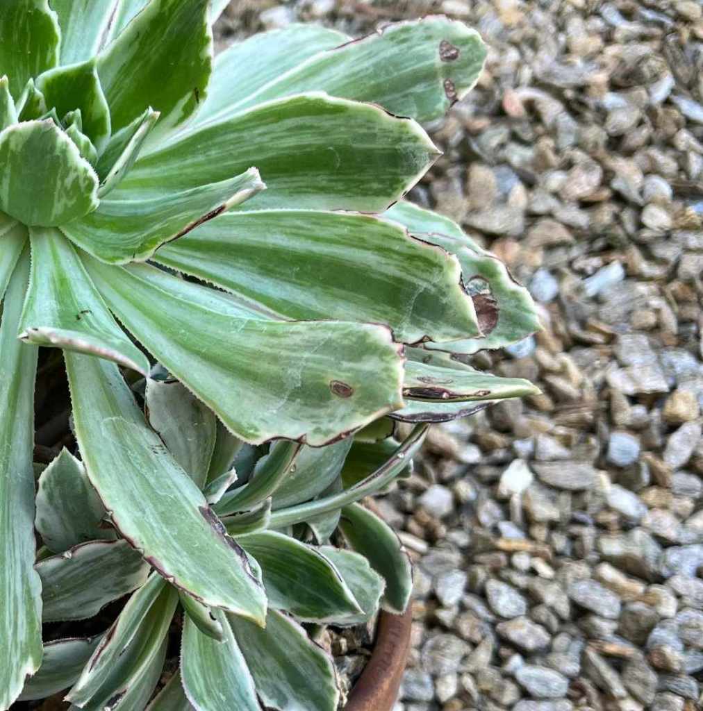 Cet Aeonium variegata a une pousse moyenne et rejette assez peu comme ‘Sunburst’.