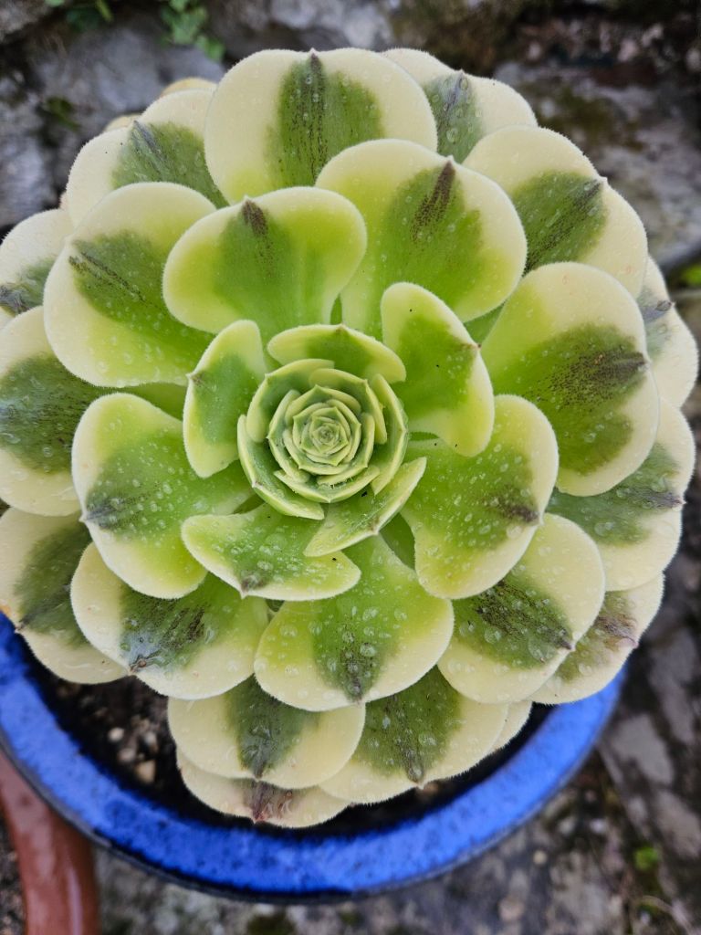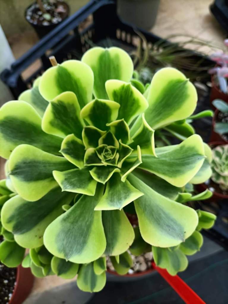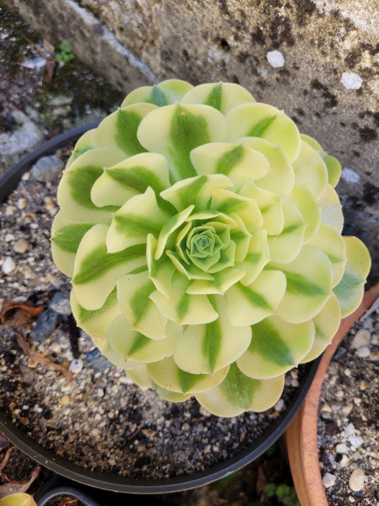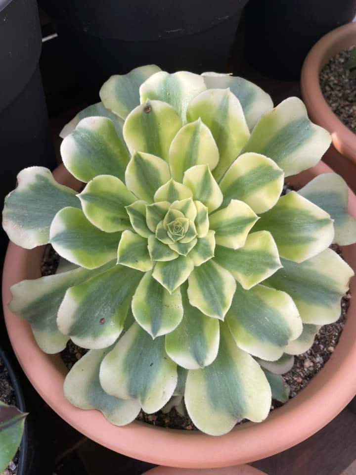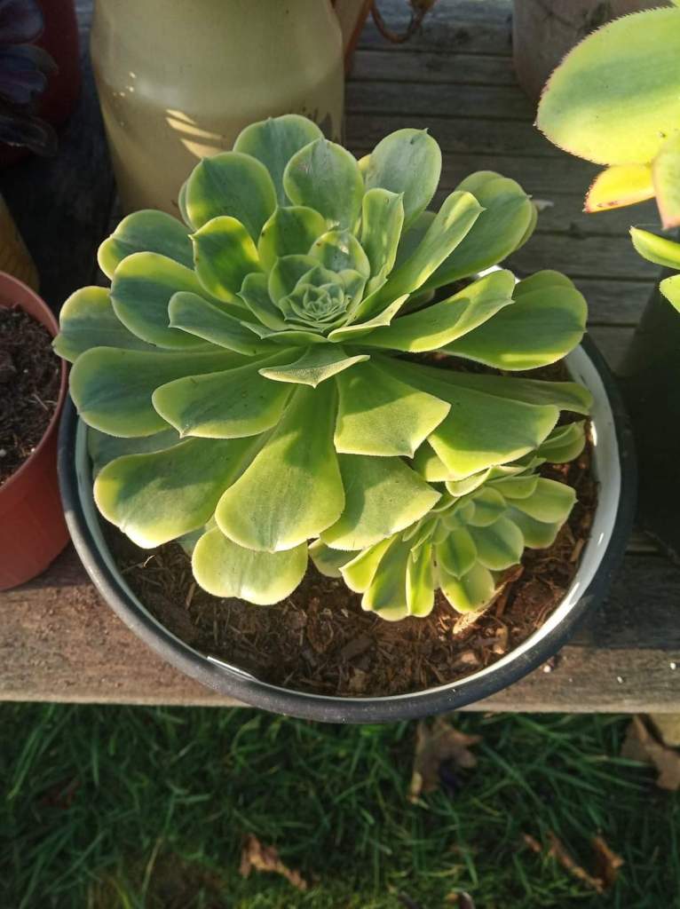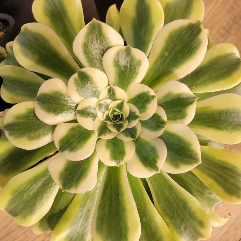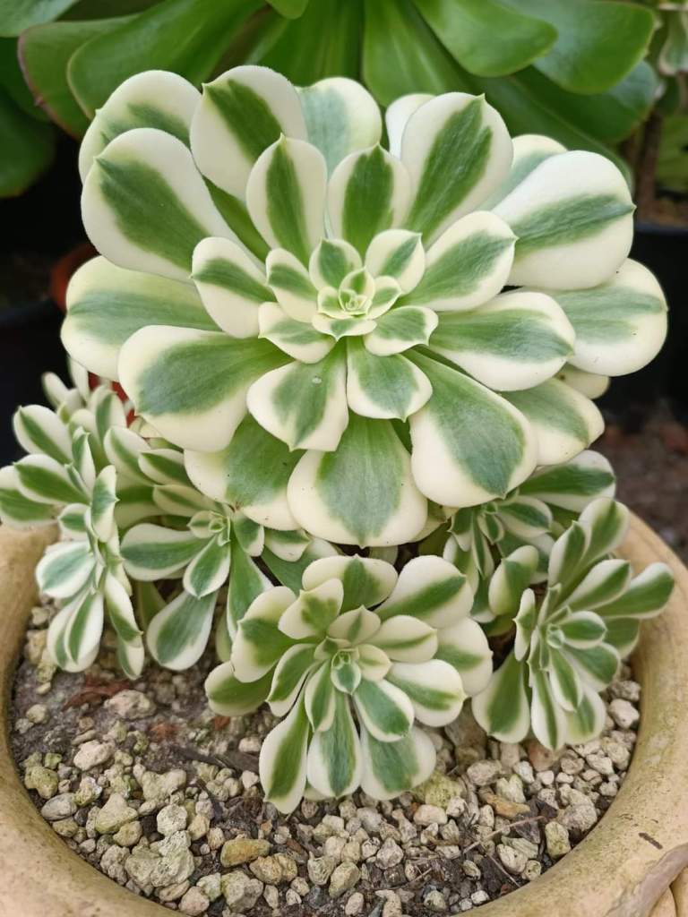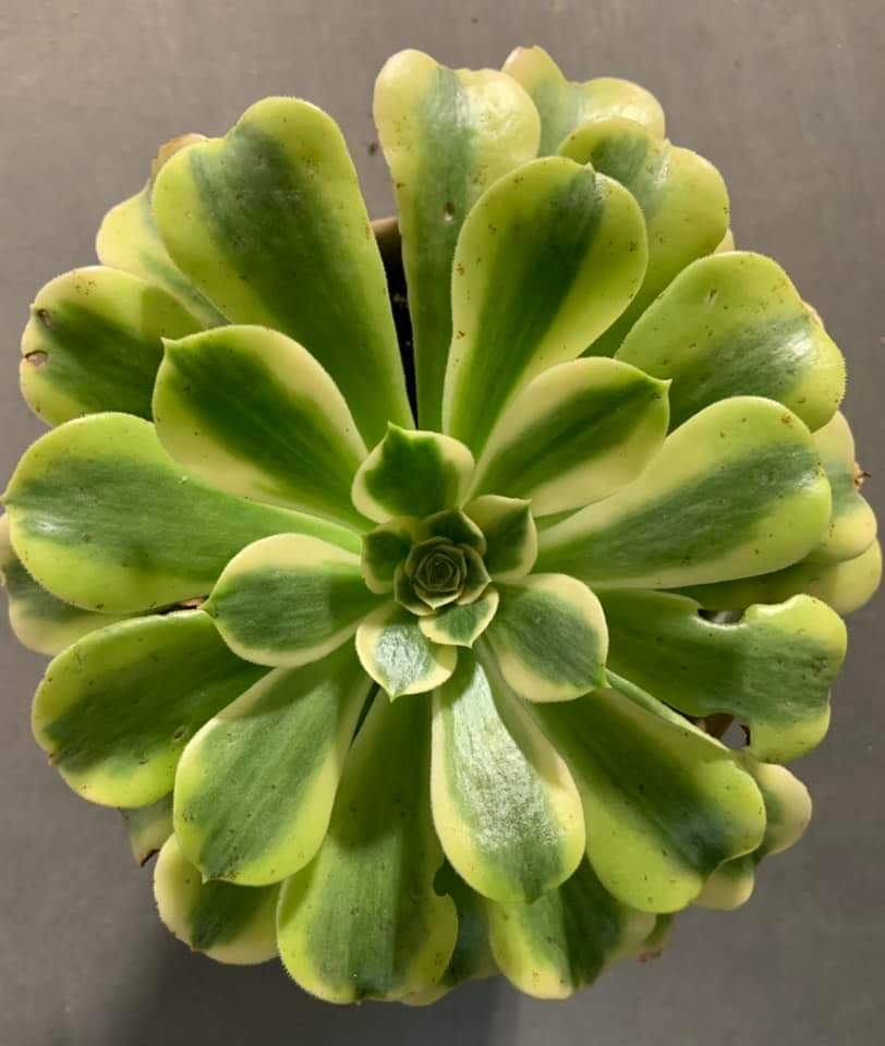 Il fait partie des Aeonium variegata qui n’évoluent que peu au fil des saisons. Il se caractérise par des teintes vertes et blanc/crème.