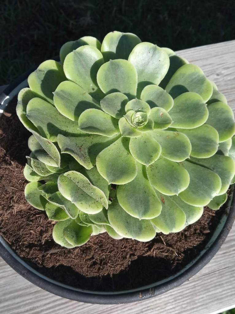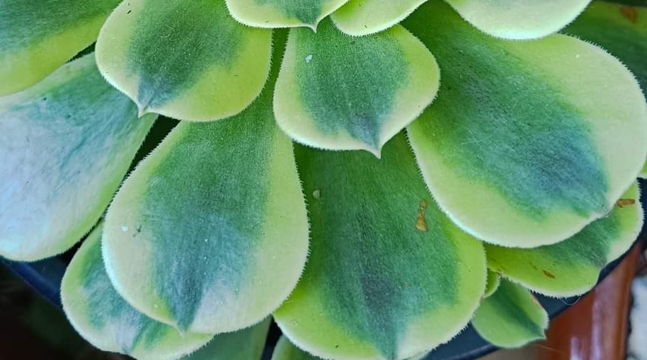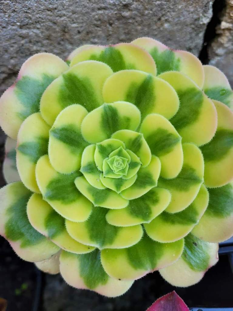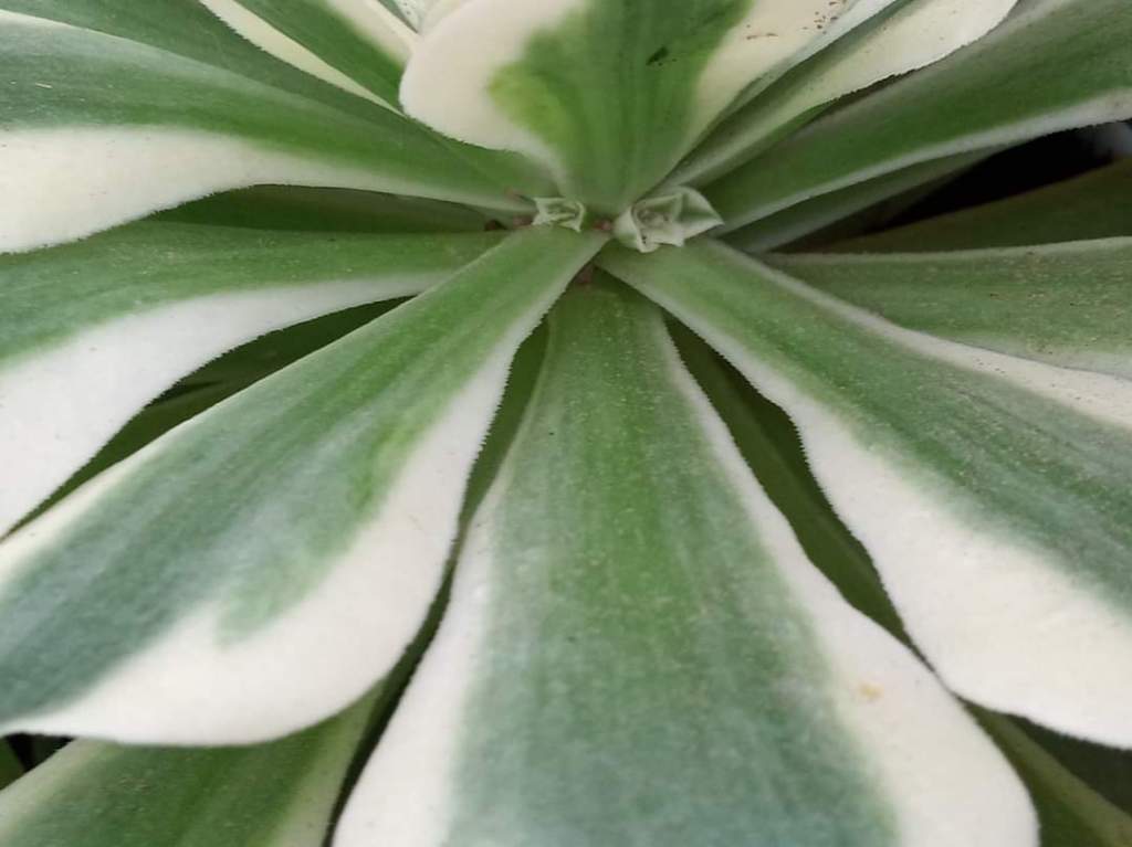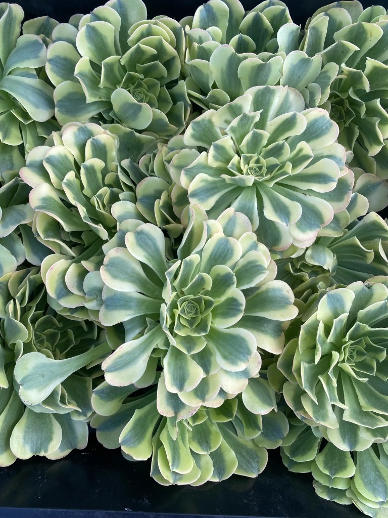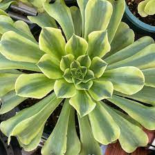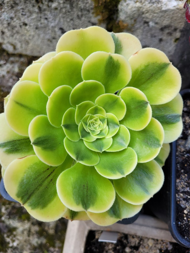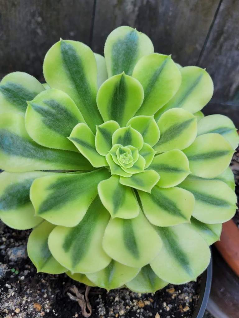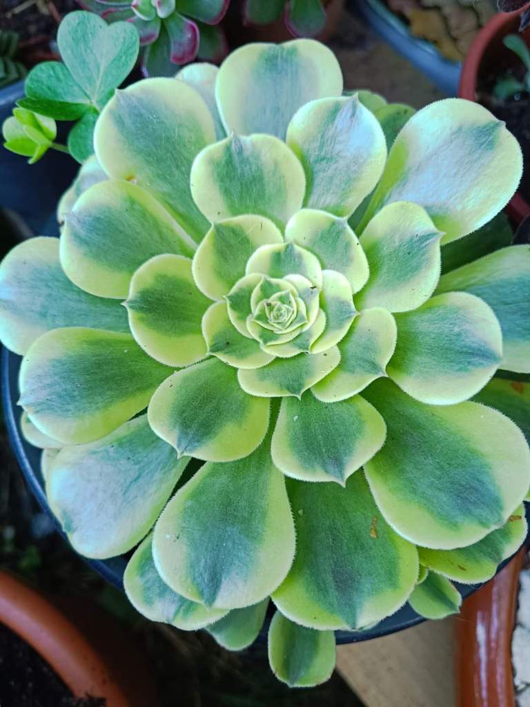 Il fait partie des Aeonium variegata qui n’évoluent que peu au fil des saisons. Il se caractérise par des teintes vertes et blanc/crème.