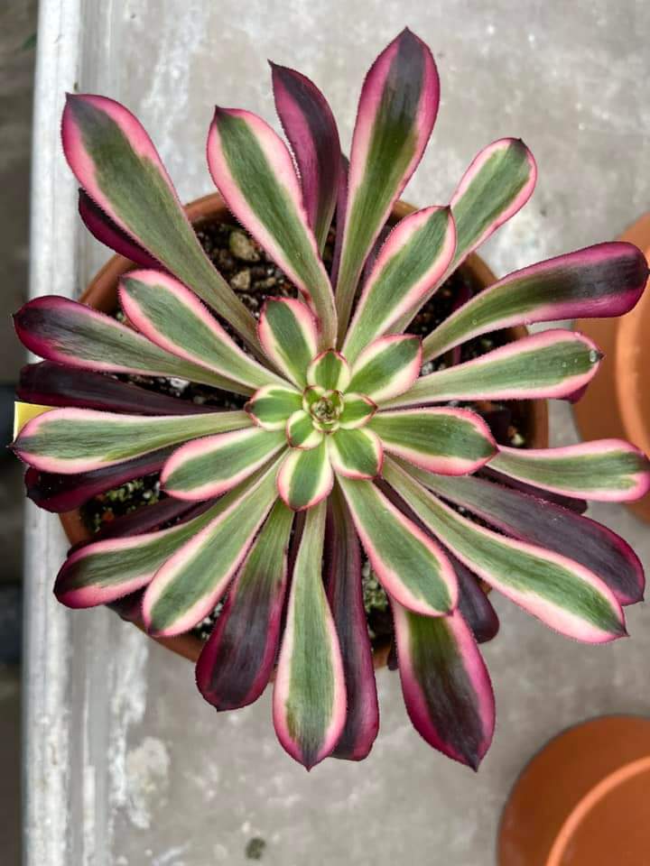 DESCRIPTION : L’Aeonium ‘Saint Simon Violet’ est un Aeonium variegata issu de l’Aeonium ‘Atropurpureum’.