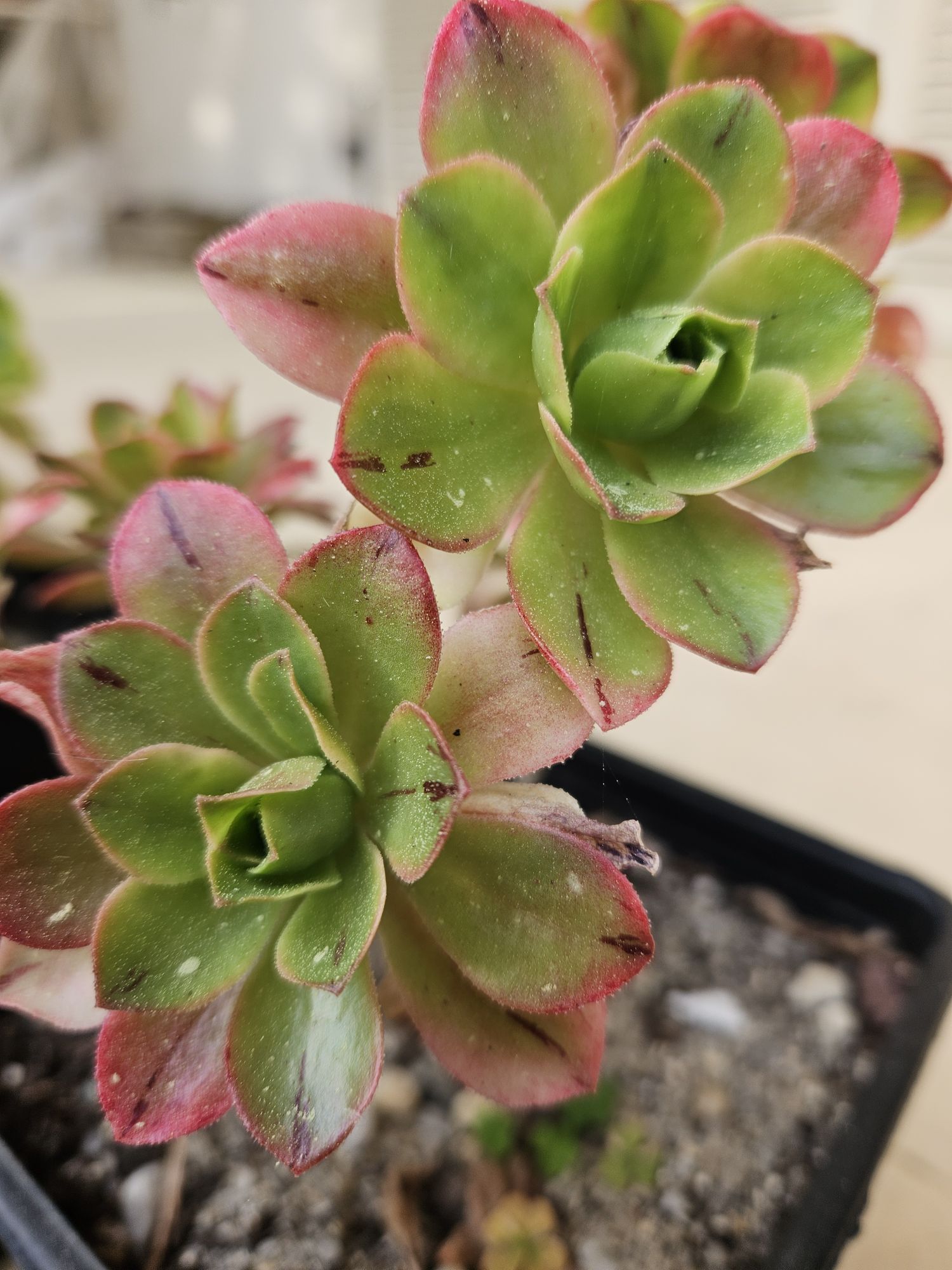DESCRIPTION : L’Aeonium ‘Christmas’ est un Aeonium variegata qui serait issu de x holospathulatum mais cette origine n’est pas garantie. C’est un Aeonium qui ramifie plutôt facilement et qui ne prend pas des dimensions trop importantes. Son feuillage est constitué de feuilles plutôt fines et mat.