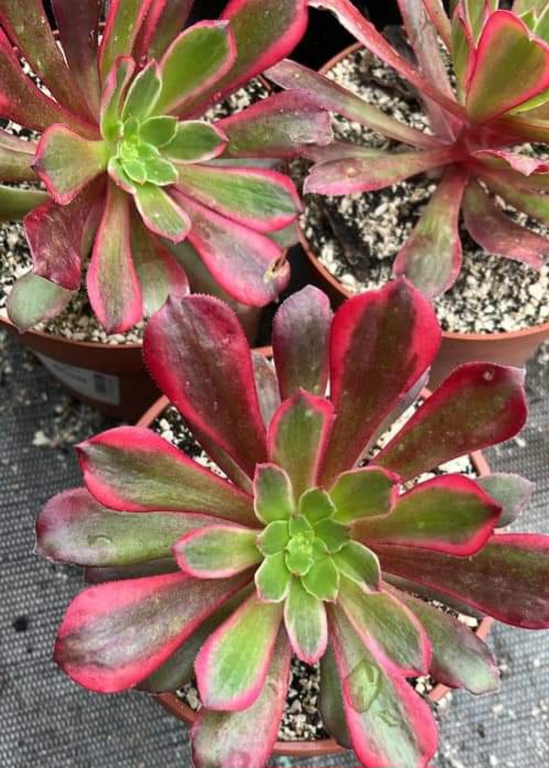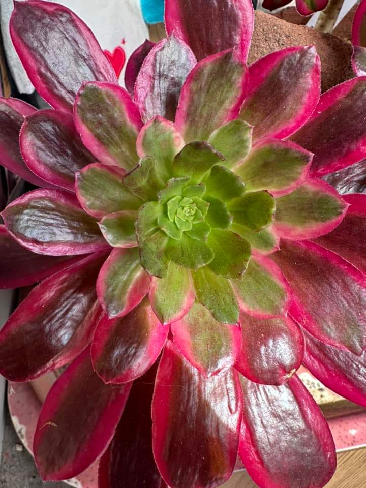 En hiver, la feuille est composée d’une bande centrale verte avec des bordures de couleur jaune crème qui se teintent très facilement de rouge plus l’exposition est lumineuse. Quand la pousse est active, le cœur de la rosette est vert et crème mais les anciennes feuilles sont généralement rouge voire violet ce qui est une caractéristique de cet Aeonium : Il est vraiment rarement tout vert.