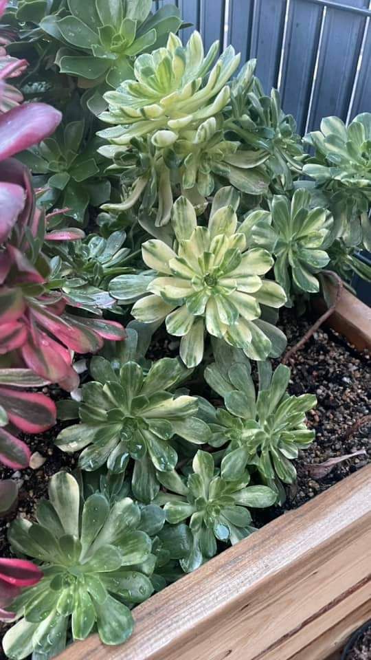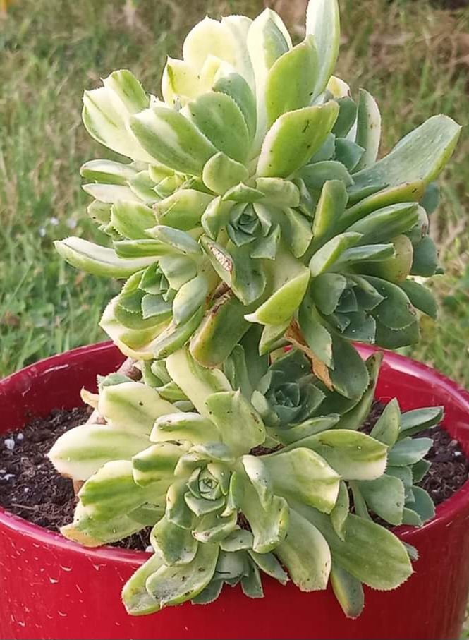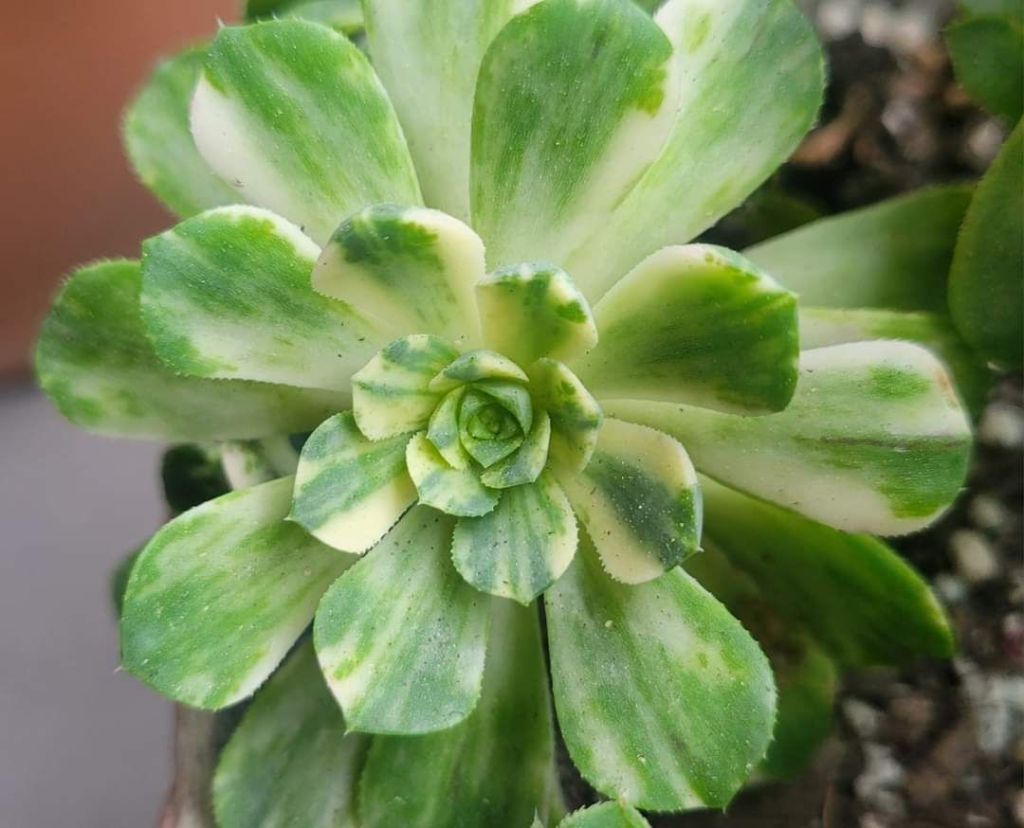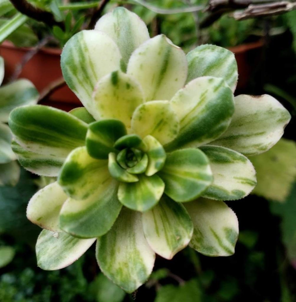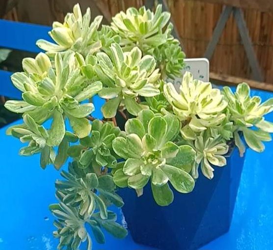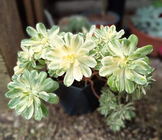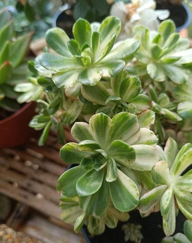 Cet Aeonium forme un arbuste de petite taille (20-30cm de haut) aux tiges fines et frêles avec de nombreuses rosettes qui mesure environ 8-10 centimètres. La variegation de ses rosettes est aléatoire, comportant de nombreuses stries aux couleurs vertes et blanc/crème.