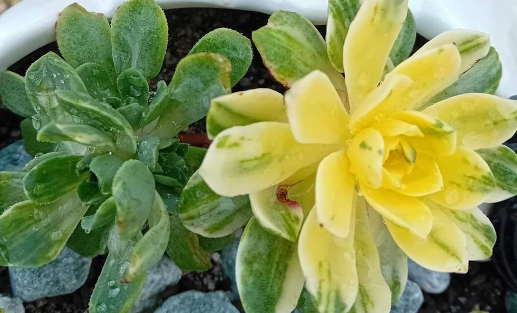 On observe aussi régulièrement des réversions de rosettes avec cet Aeonium mais généralement la réversion n’est pas observée sur la totalité du pied (pour information, une réversion est une mutation inverse, c’est à dire un retour à la forme originale, c’est à dire l’Aeonium castello-pavaie pour ‘Suncup’). Il peut aussi perdre momentanément sa variegation en phase de croissance hivernale et devenir tout vert à cette période.