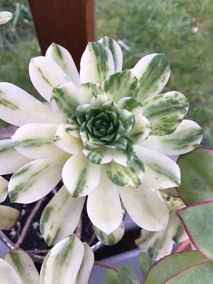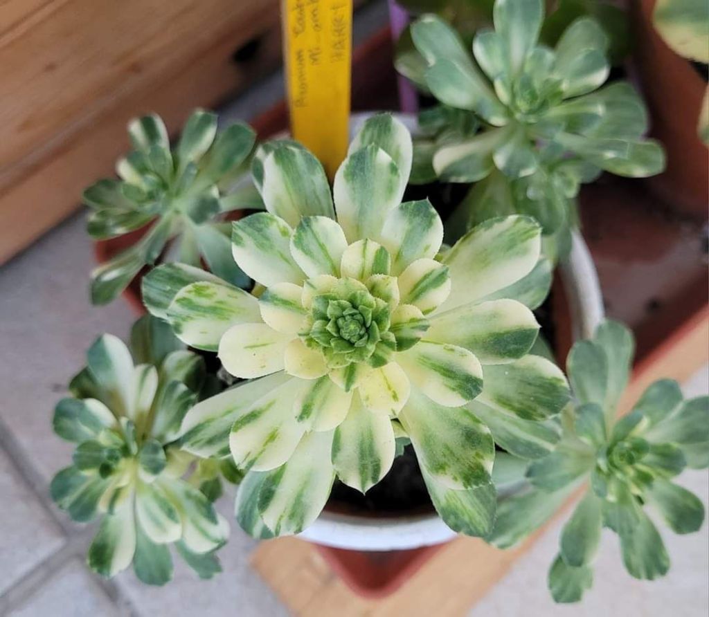 Cet Aeonium fait partie des Aeonium variegata qui sont apparus bien avant l’apparition des nombreuses mutations venant de Chine. Son origine exacte est malheureusement inconnue, si jamais vous avez des informations à ce sujet n’hésitez pas à me contacter.
