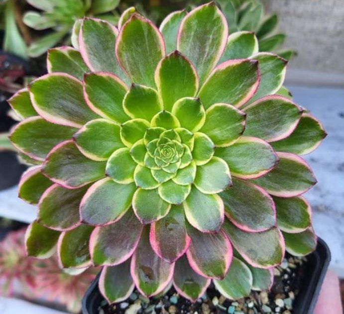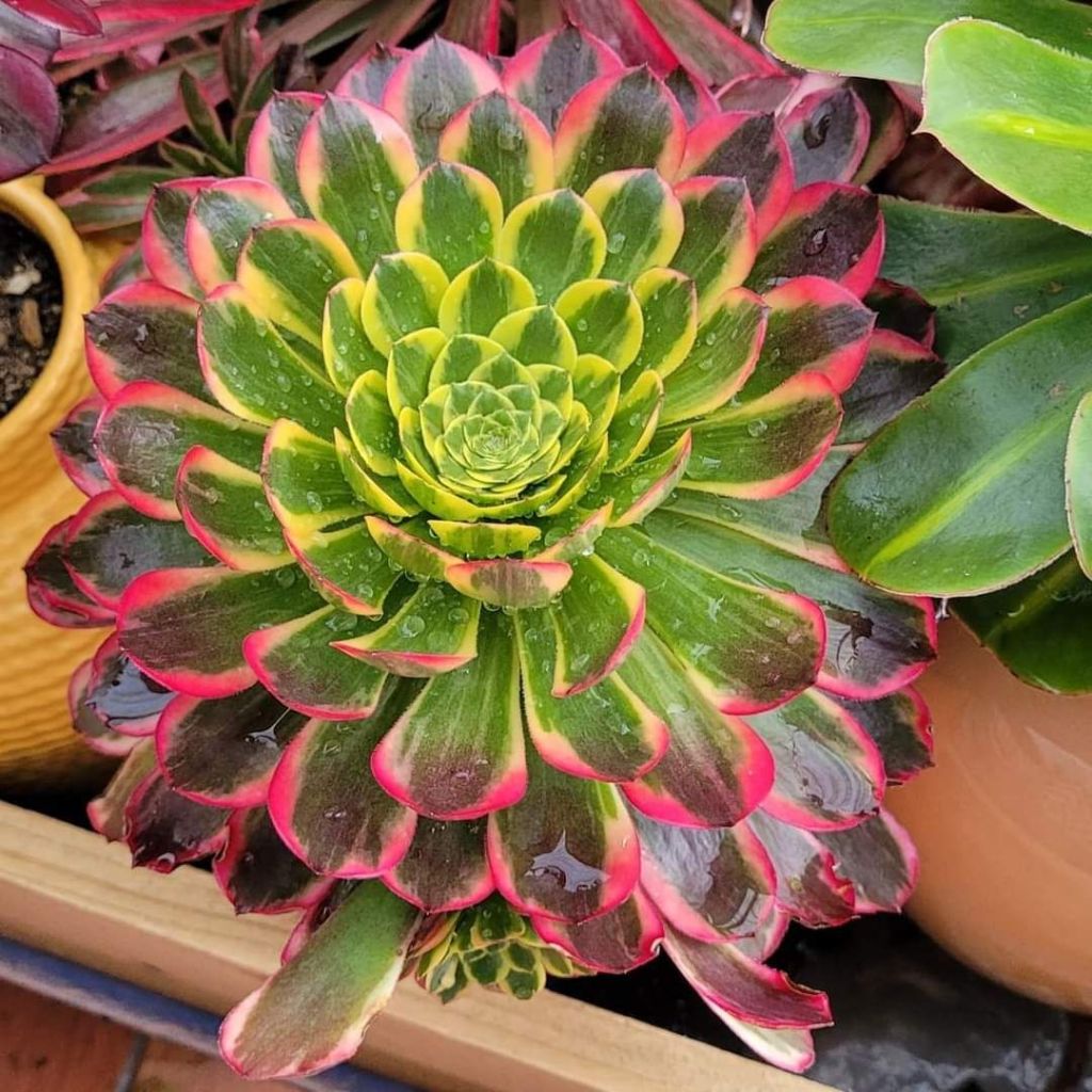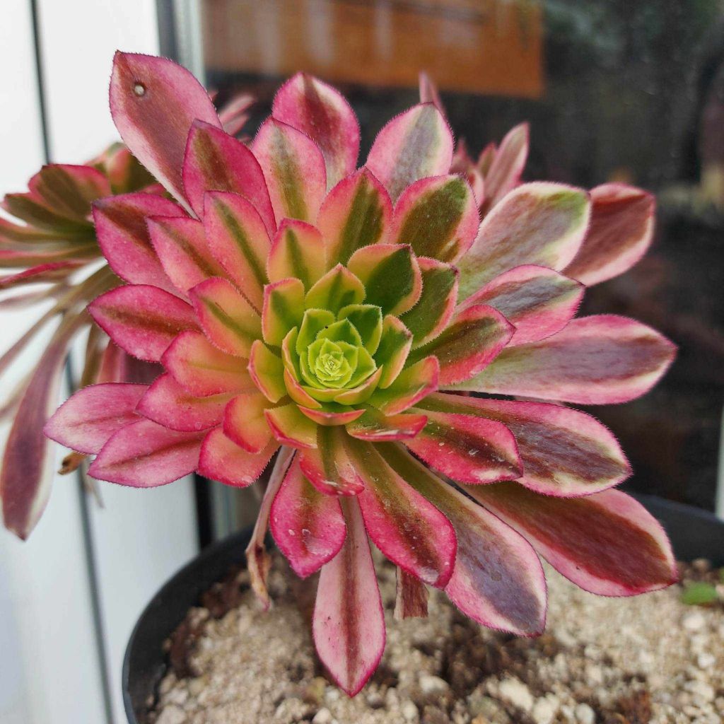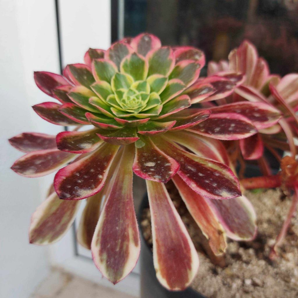 Note 2 : Je ferais prochainement une fiche sur l’Aeonium ‘Alice’, une autre mutation de ‘Fiesta’. Mais déjà quelques observations. ‘Alice’ est un Aeonium très fragile et pas très stable, de nombreux rejets qu’il fait sont en fait des ‘Sunrise’ ce qui tendrait à démontrer qu’il en est une mutation. On retrouve donc souvent des ‘Sunrise’ vendu sous le nom d’Alice ce qui n’est pas une tromperie intentionnelle des vendeurs vu la remarque précédente. Voici quelques photos de vrais Alice. Plus de détails à venir sur sa fiche.