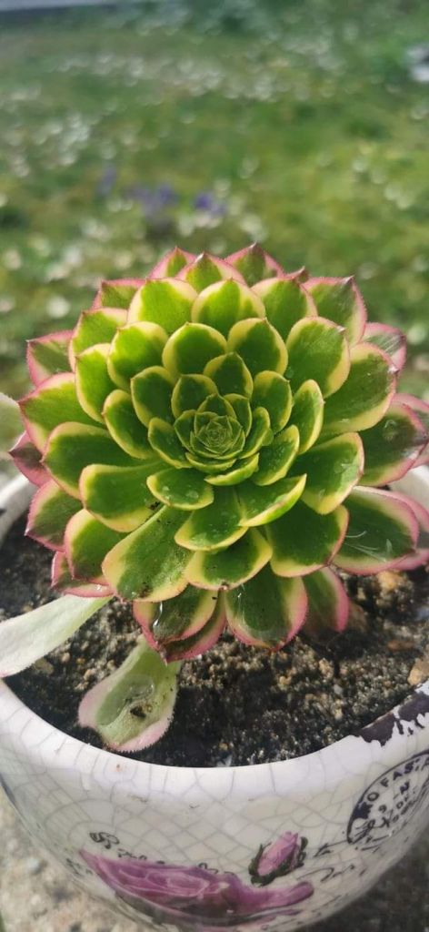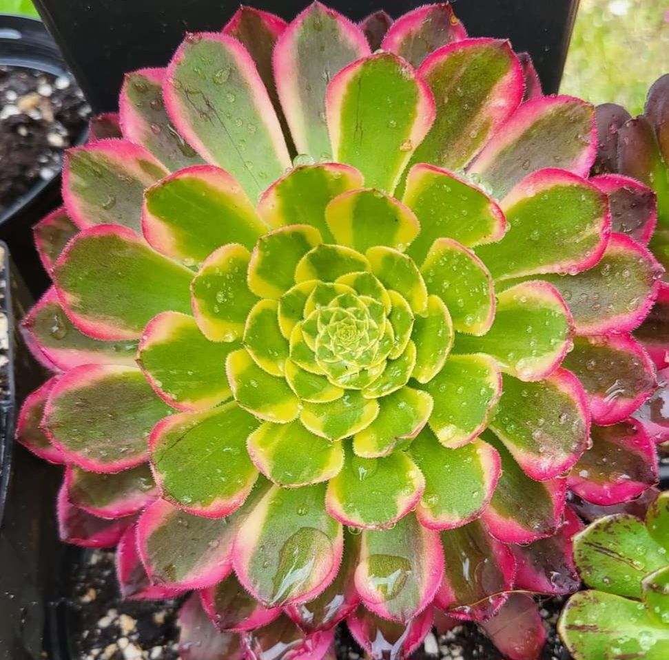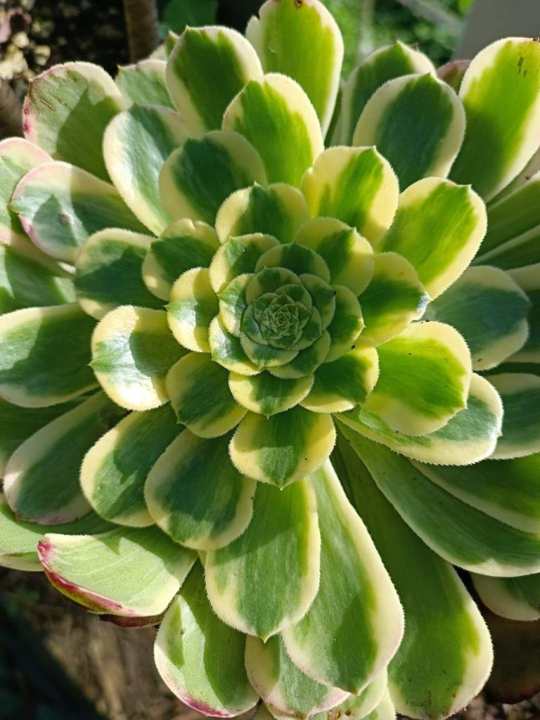 DESCRIPTION : L’Aeonium ‘Sunrise’ est un Aeonium arbustif variegata issu de la mutation de l’Aeonium ‘Fiesta’.
