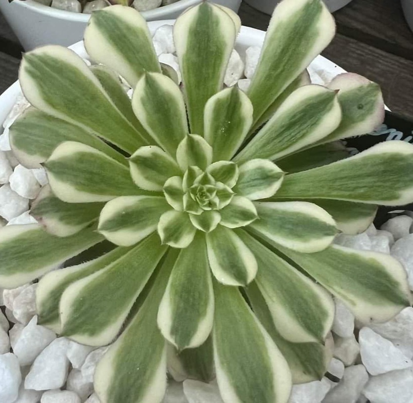 DESCRIPTION : L’Aeonium ‘Garnet White’ est un Aeonium variegata issu d’un Aeonium non encore identifié.