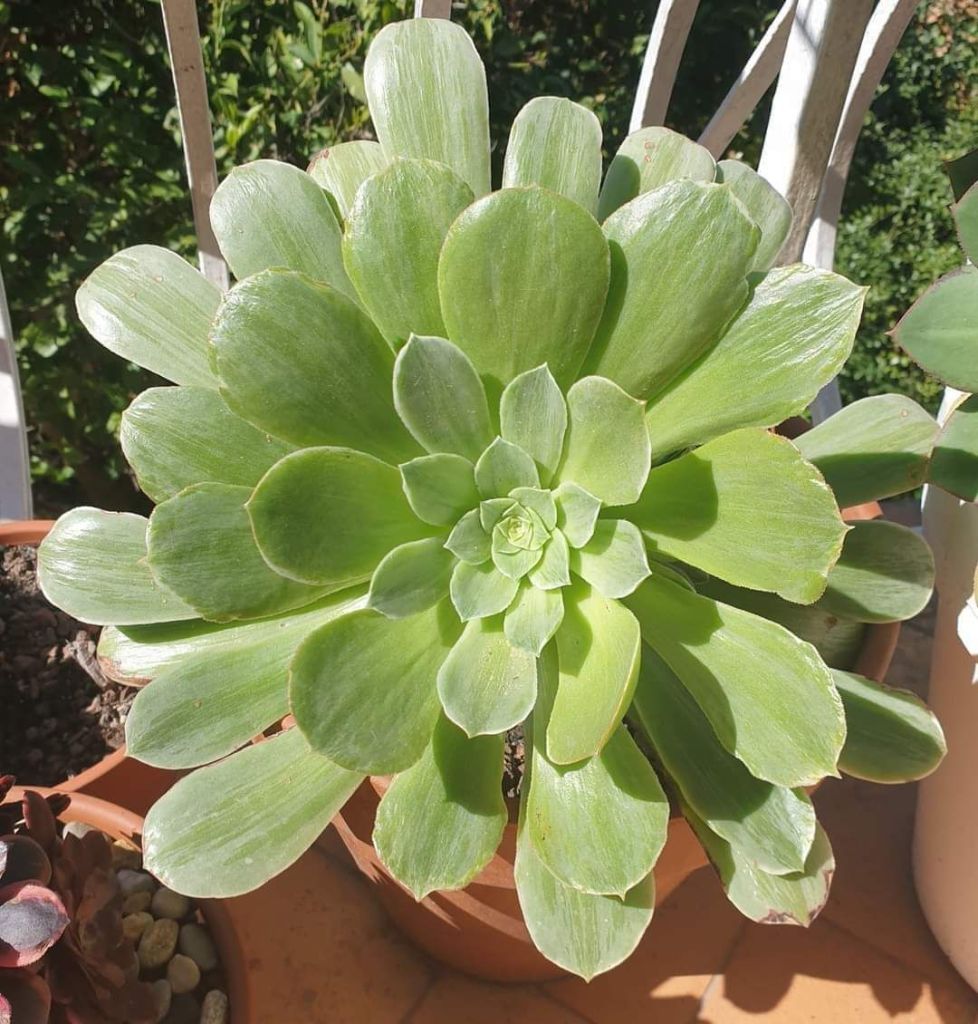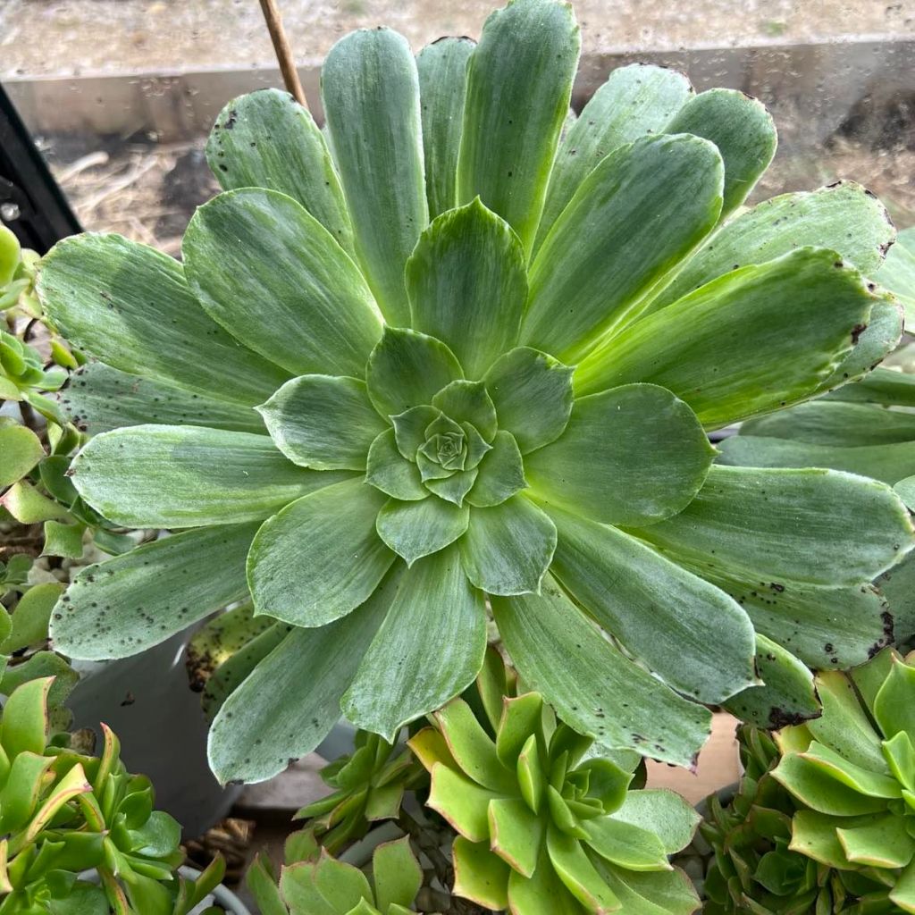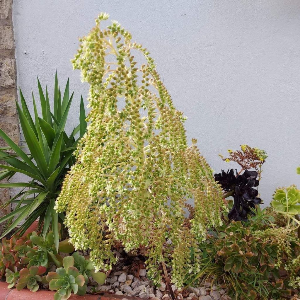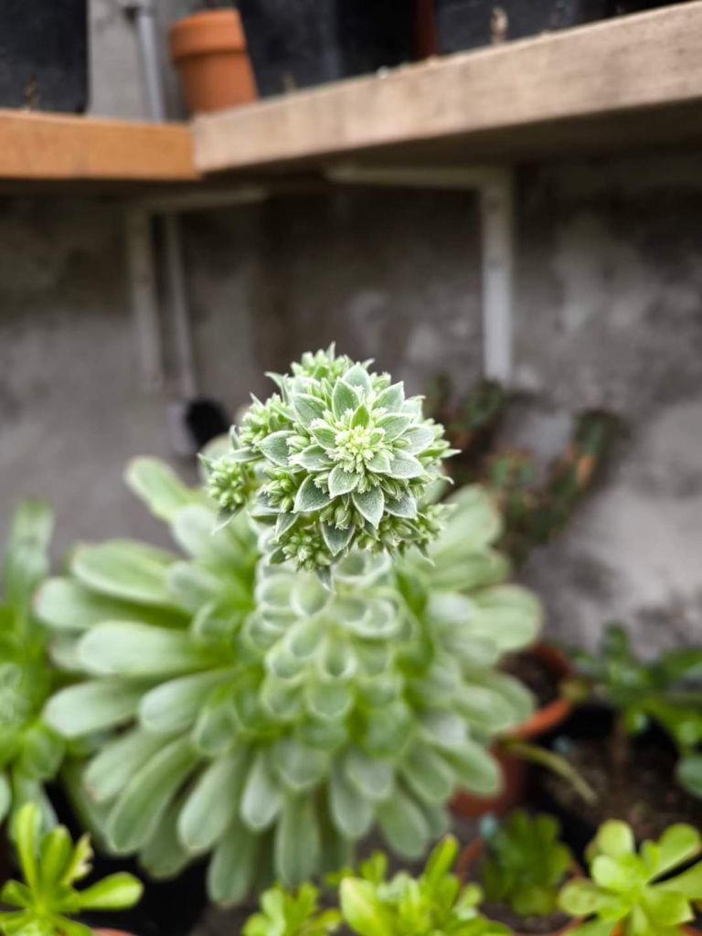 Cet Aeonium reste de forme plutôt compact et ne monte pas de façon arbustive. Il évolue peu au fil des saisons, son feuillage restant vert avec de nombreuses stries argentées. Ces variegations peuvent plus ou moins s’atténuer à certains moments de l’année mais elles réapparaissent toujours, aucune inquiétude à avoir.