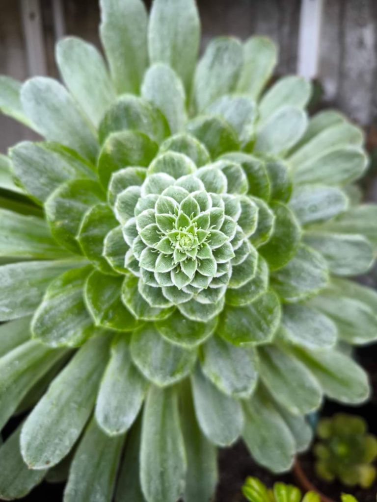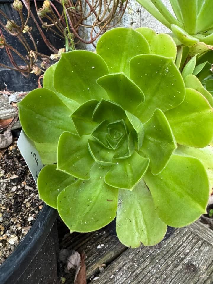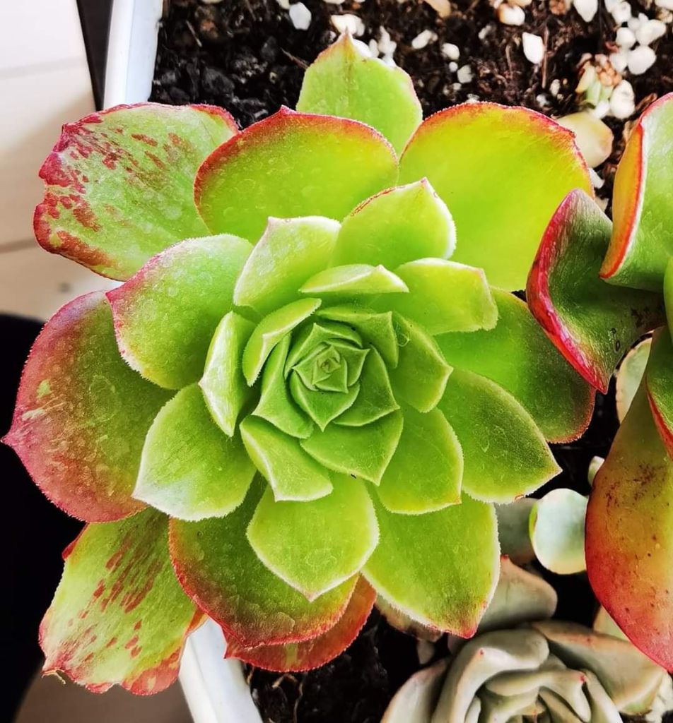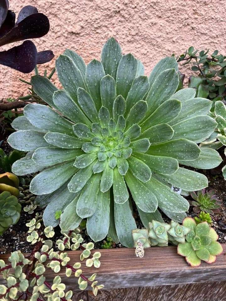 Cet Aeonium reste de forme plutôt compact et ne monte pas de façon arbustive. Il évolue peu au fil des saisons, son feuillage restant vert avec de nombreuses stries argentées. Ces variegations peuvent plus ou moins s’atténuer à certains moments de l’année mais elles réapparaissent toujours, aucune inquiétude à avoir.