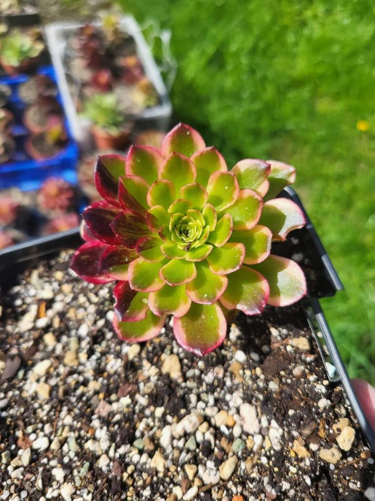 ORIGINE : Issu de la mutation de l’Aeonium ‘Sunrise’ et de l’Aeonium ‘Fiesta’. C’est une mutation de type « BigBang« .