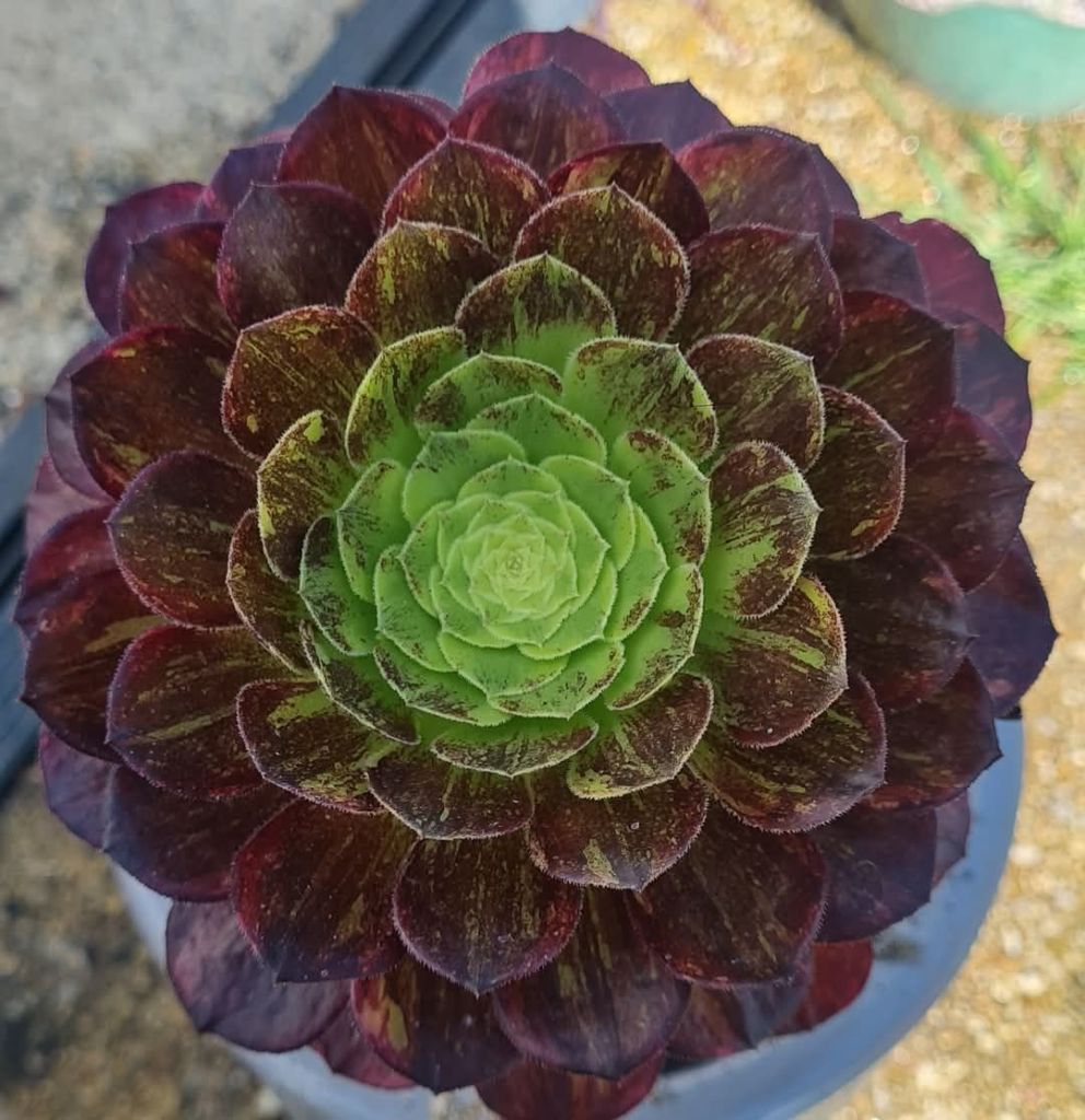 DESCRIPTION : L’Aeonium ‘Fiesta Bigbang’ est un Aeonium arbustif variegata qui se caractérise par des stries noires (et parfois tirant plus sur des teintes rouges orangées) réparties de façon aléatoires sur les feuilles.
